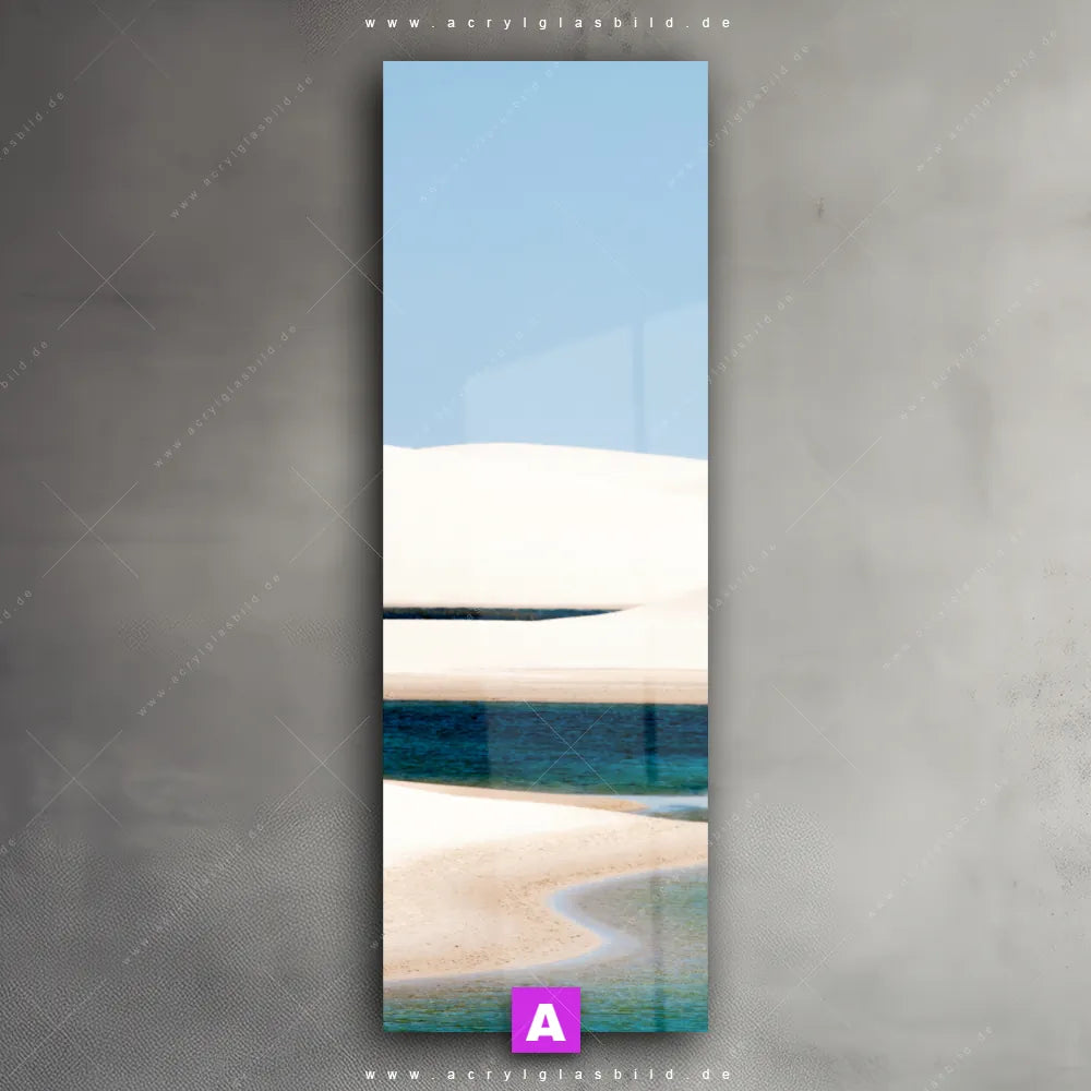 <b>Produktart:</b> Acrylglasbild | Glasbild | Wandbild aus Kunstglas | <b> Motiv:</b> Sanddünen und Seen | <b> Bildausrichtung:</b> Schmal | <b> Max. Motiv-Größe:</b> 270cm breit | 180cm hoch | <b> Verfügbare Formate: </b> Quadrat, Querformat, Hochformat, Panorama, Schmal, Rund | <b> Kategorie:</b> Landschaften | <b> Farben:</b> Blau, Hellblau, Hellgrün, Ocker, Türkis, Beige | <b> Kunstformen:</b> Fotografie | <b> Kunststile:</b> Natürlich - Realistisch