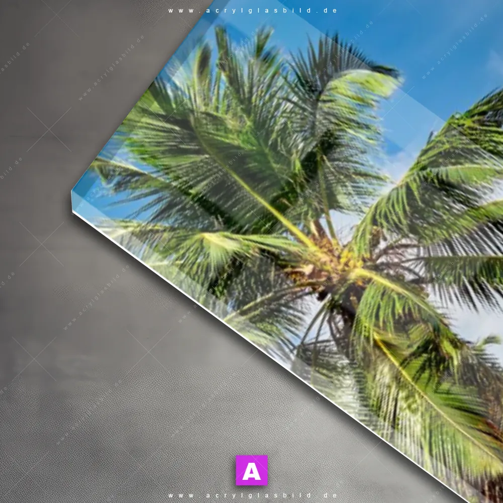 Das Motiv Schöner Strand mit Palmen wird im UV-Direktdruck in den Farben Blau, Türkis, Grün, Braun auf die Rückseite einer 5mm starken, transparenten Acrylglasplatte gedruckt. Das durchscheinende Motiv Traumstrand mit Felsenlandschaft im Natürlich - Realistisch Stil wird anschließend vollflächig mit einer weißen Schicht hinterlegt. Das Landschaften, Strand - Meer Acrylglasbild | Schmal erhält so eine bemerkenswerte Farbbrillanz, hohe Schärfe und erstaunliche Tiefenwirkung.