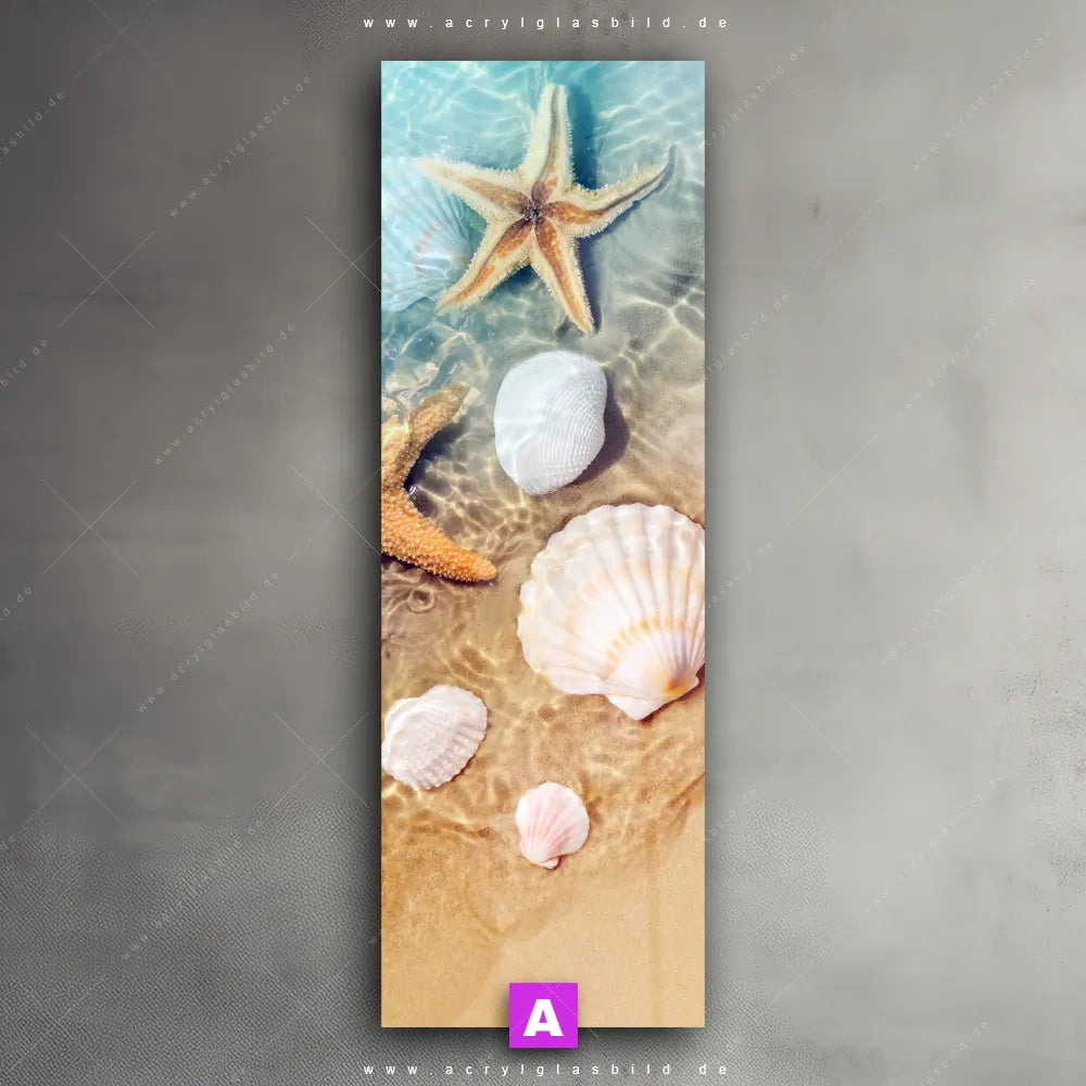 <b>Produktart:</b> Acrylglasbild | Glasbild | Wandbild aus Kunstglas | <b> Motiv:</b> Seesterne & Muscheln | <b> Bildausrichtung:</b> Schmal | <b> Max. Motiv-Größe:</b> 180cm breit | 270cm hoch | <b> Verfügbare Formate: </b> Quadrat, Querformat, Hochformat, Panorama, Schmal, Rund | <b> Kategorie:</b> Strand - Meer | <b> Farben:</b> Beige, Türkis | <b> Kunstformen:</b> Fotografie, Digitale Kunst | <b> Kunststile:</b> Modern Art
