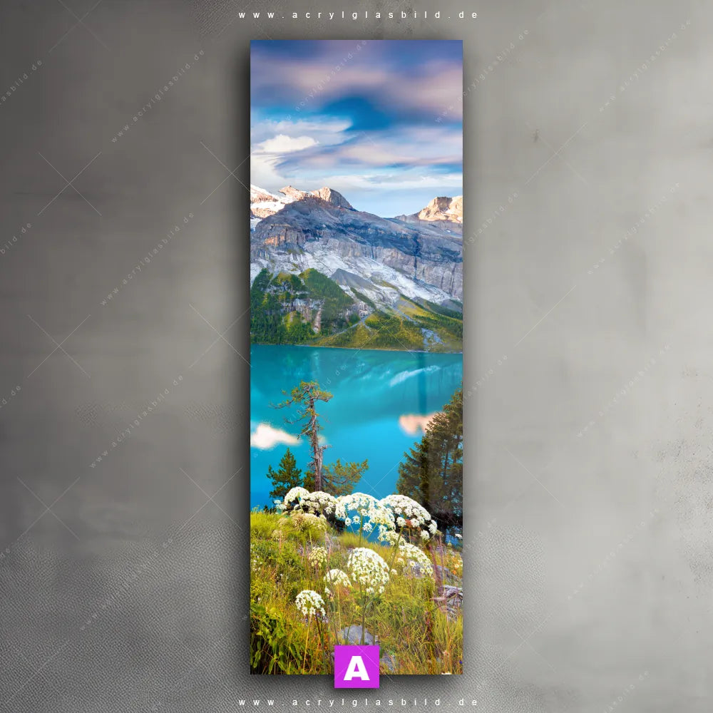 <b>Produktart:</b> Acrylglasbild | Glasbild | Wandbild aus Kunstglas | <b> Motiv:</b> Sommermorgen am Bergsee | <b> Bildausrichtung:</b> Schmal | <b> Max. Motiv-Größe:</b> 70cm breit | 210cm hoch | <b> Verfügbare Formate: </b> Quadrat, Querformat, Hochformat, Panorama, Schmal, Rund | <b> Kategorie:</b> Landschaften | <b> Farben:</b> Grün, Türkis | <b> Kunstformen:</b> Fotografie | <b> Kunststile:</b> Natürlich - Realistisch