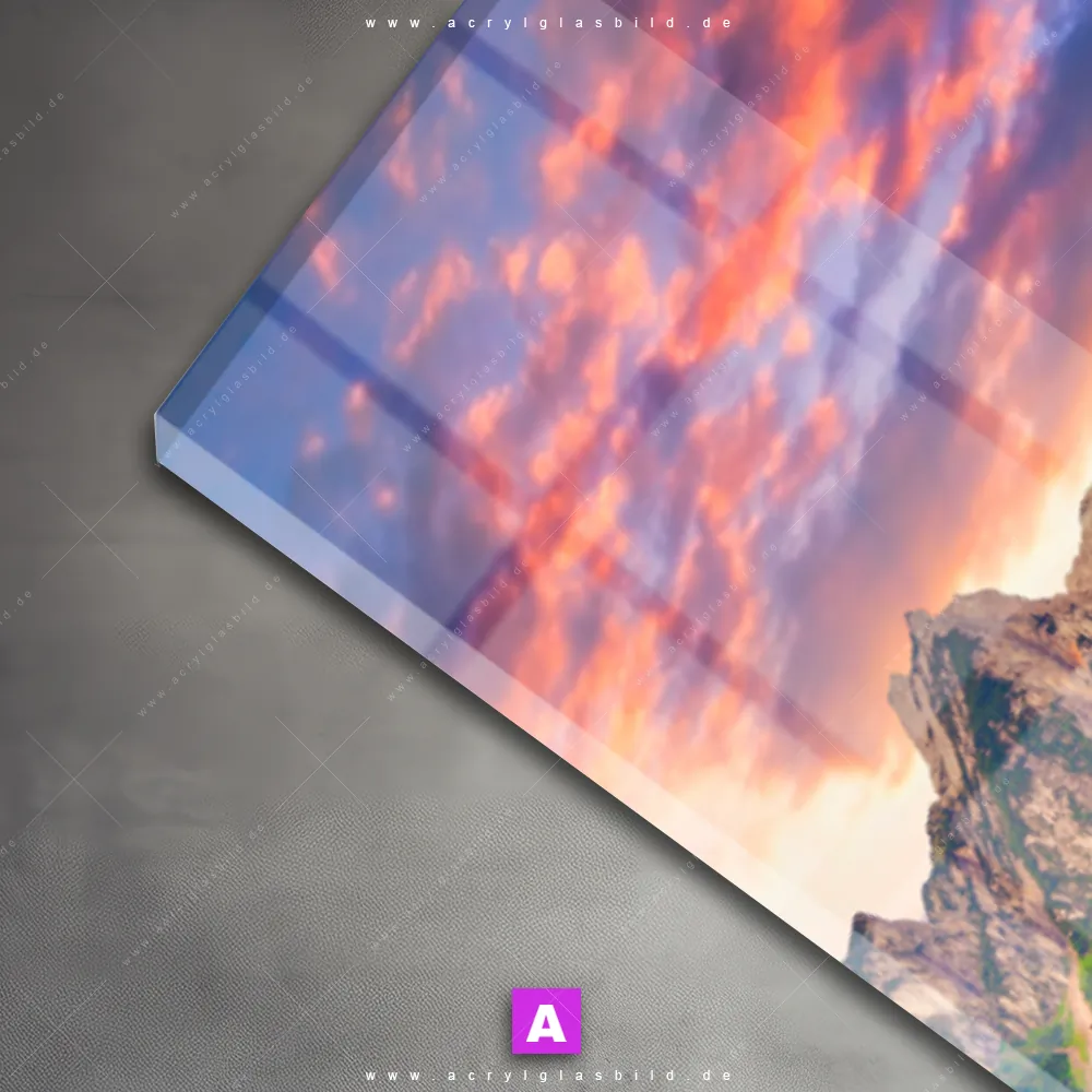 Das Motiv Sonnenaufgang am Bergsee wird im UV-Direktdruck in den Farben Bunt auf die Rückseite einer 5mm starken, transparenten Acrylglasplatte gedruckt. Das durchscheinende Motiv Boote am Ufer eines Bergsees im Natürlich - Realistisch Stil wird anschließend vollflächig mit einer weißen Schicht hinterlegt. Das Landschaften Acrylglasbild | Schmal erhält so eine bemerkenswerte Farbbrillanz, hohe Schärfe und erstaunliche Tiefenwirkung.