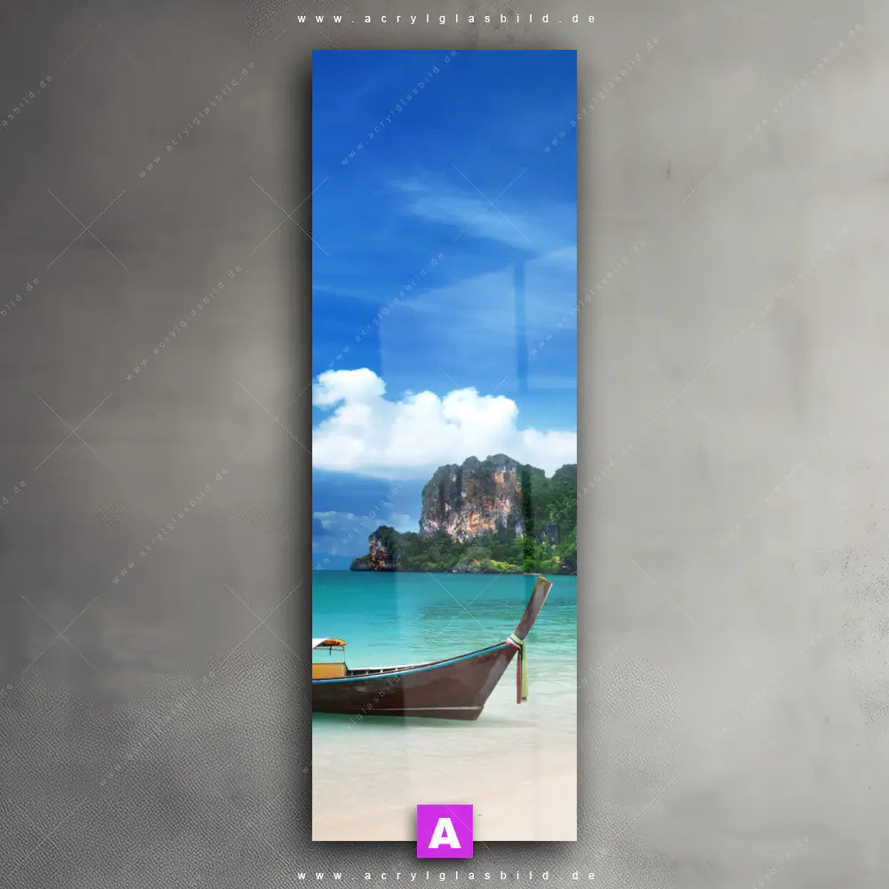 Das Motiv Strand in Thailand wird im UV-Direktdruck in den Farben Blau, Türkis, Grün, Beige, Braun auf die Rückseite einer 5mm starken, transparenten Acrylglasplatte gedruckt. Das durchscheinende Motiv Boot im Paradies im Natürlich - Realistisch Stil wird anschließend vollflächig mit einer weißen Schicht hinterlegt. Das Landschaften, Strand - Meer Acrylglasbild | Schmal erhält so eine bemerkenswerte Farbbrillanz, hohe Schärfe und erstaunliche Tiefenwirkung.