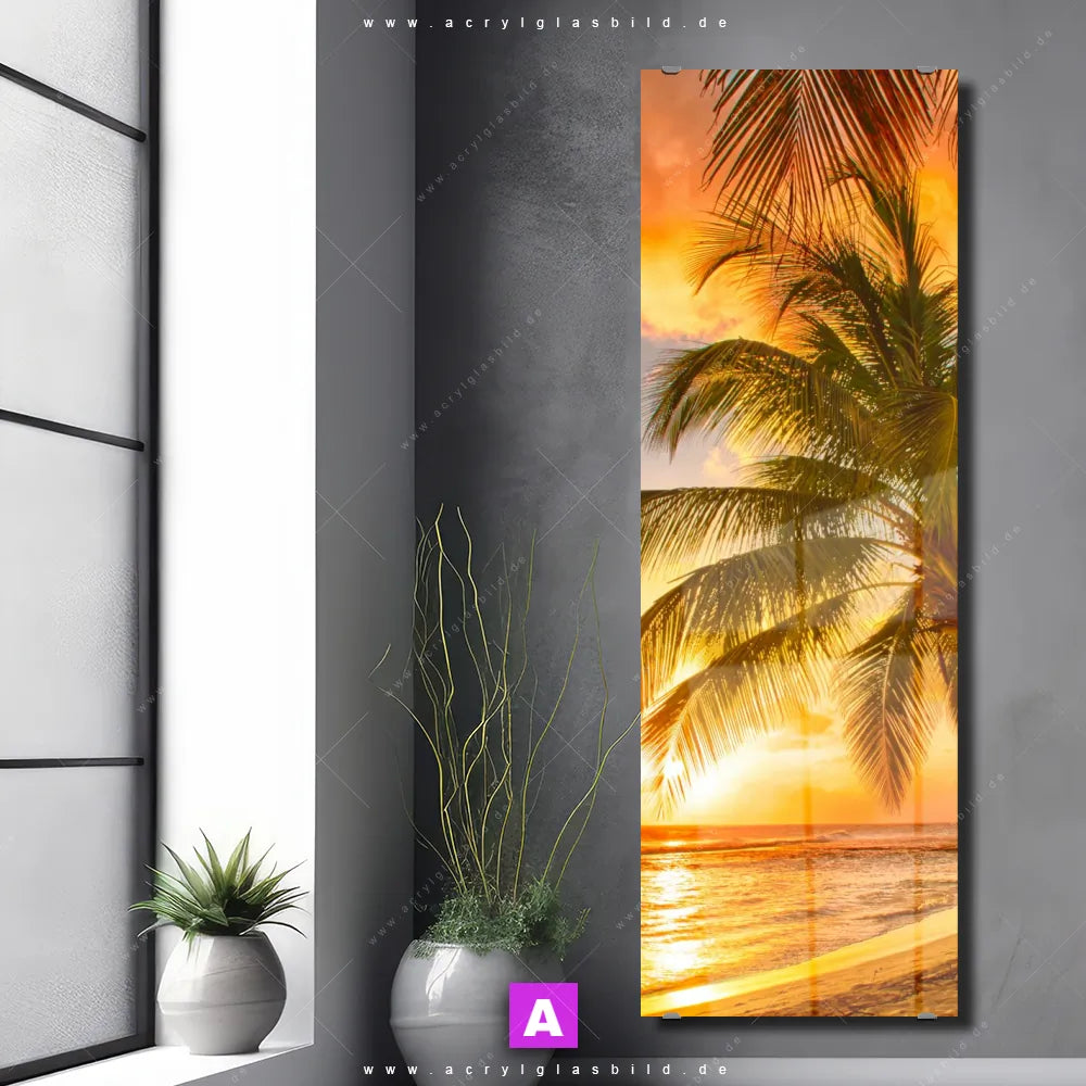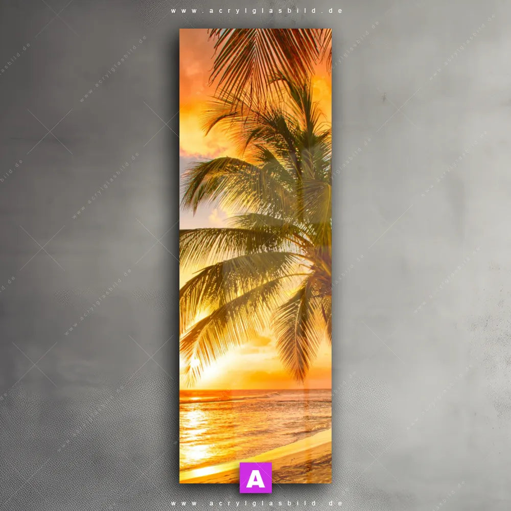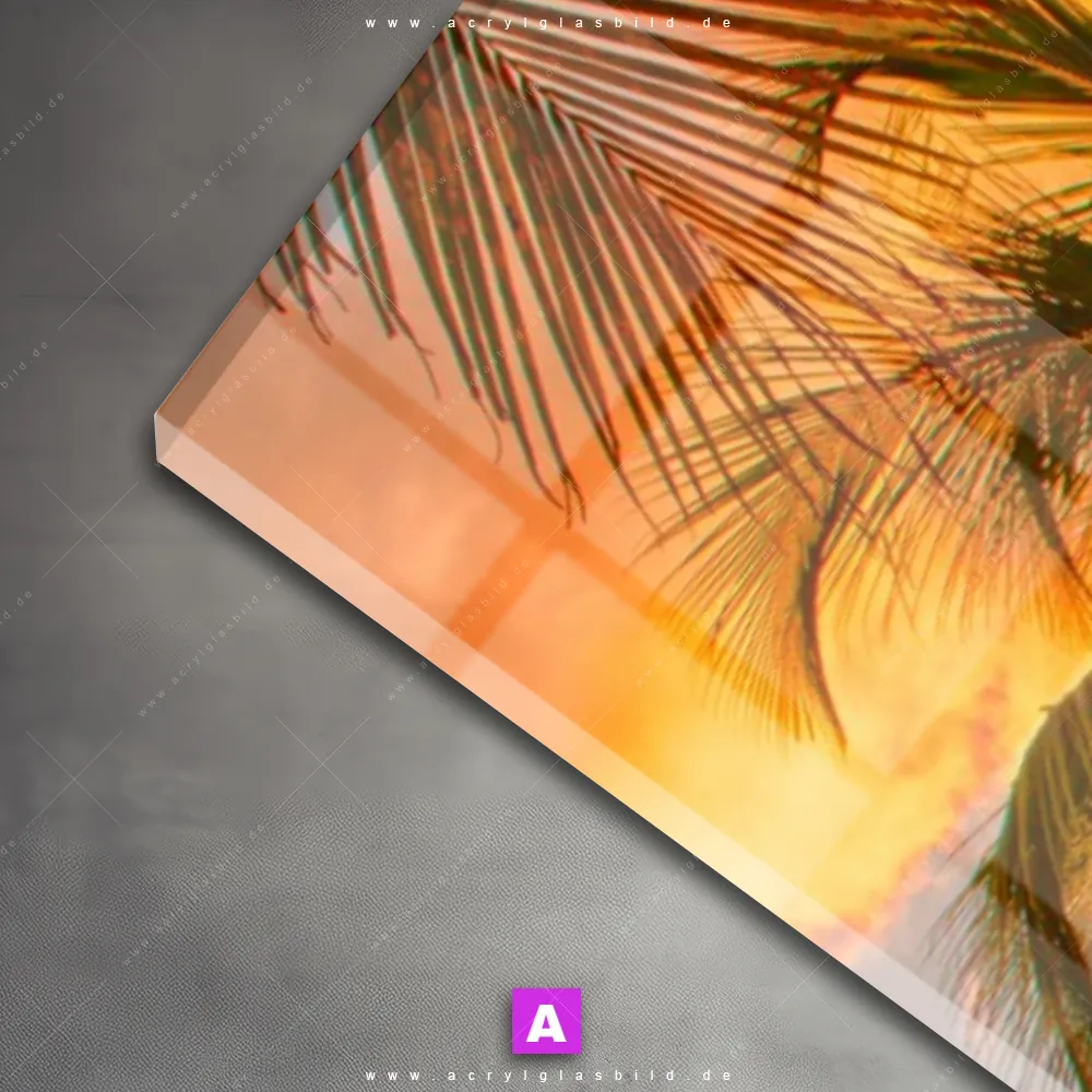 Die einzigartigen Farben in Blau, Orange, Beige machen das Acrylglasbild Palmen bei Sonnenuntergang mit Horizont, Palmen, Insel, Sommer, Südsee - Karibik, Urlaub - Reisen, Sonnenuntergang - Sonnenaufgang zu einem echten Hingucker. Egal ob deine Einrichtung minimalistisch, modern oder doch eher wild und ausgefallen ist - unser Acrylglasbild Strandpalmen auf Südseeinsel im Retro - Vintage Stil passt immer, auch in Arzt - Praxis, Wohnzimmer - Schlafzimmer, Badezimmer, Flur - Eingangsbereich.