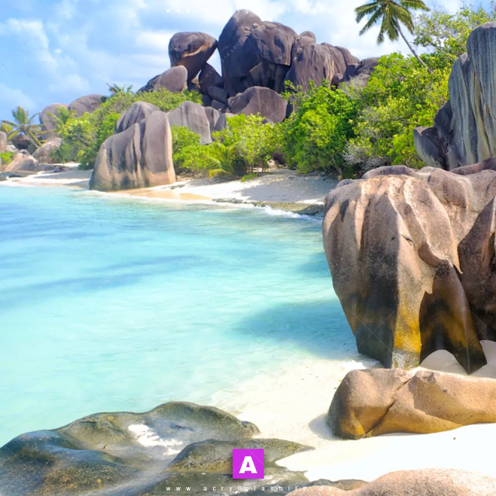 Das Motiv Südsee Paradies wird im UV-Direktdruck in den Farben Blau, Türkis, Grün, Beige, Braun auf die Rückseite einer 5mm starken, transparenten Acrylglasplatte gedruckt. Das durchscheinende Motiv Tropischer Sandstrand Seychellen im Natürlich - Realistisch Stil wird anschließend vollflächig mit einer weißen Schicht hinterlegt. Das Landschaften, Strand - Meer Acrylglasbild | Schmal erhält so eine bemerkenswerte Farbbrillanz, hohe Schärfe und erstaunliche Tiefenwirkung.