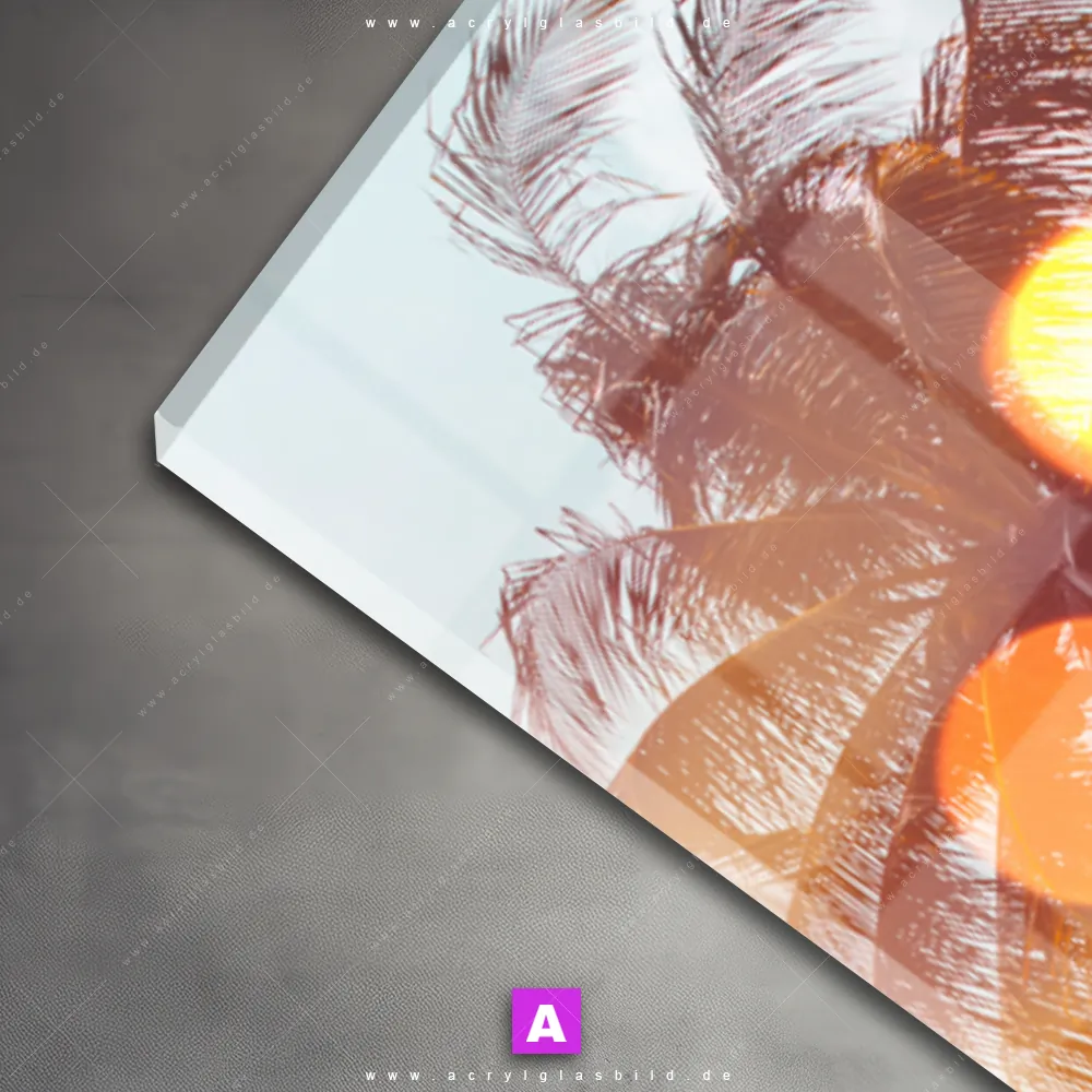 Begriffe wie Palmen, Tropen, Insel, Sommer, Südsee - Karibik, Urlaub - Reisen, Sonnenuntergang - Sonnenaufgang haben Dich auf der Suche nach Deinem neuen Wandbild aus Acrylglas inspiriert? Dann sollte das Acrylglasbild Palmen mit Lichtreflektionen den Weg zu Dir finden.