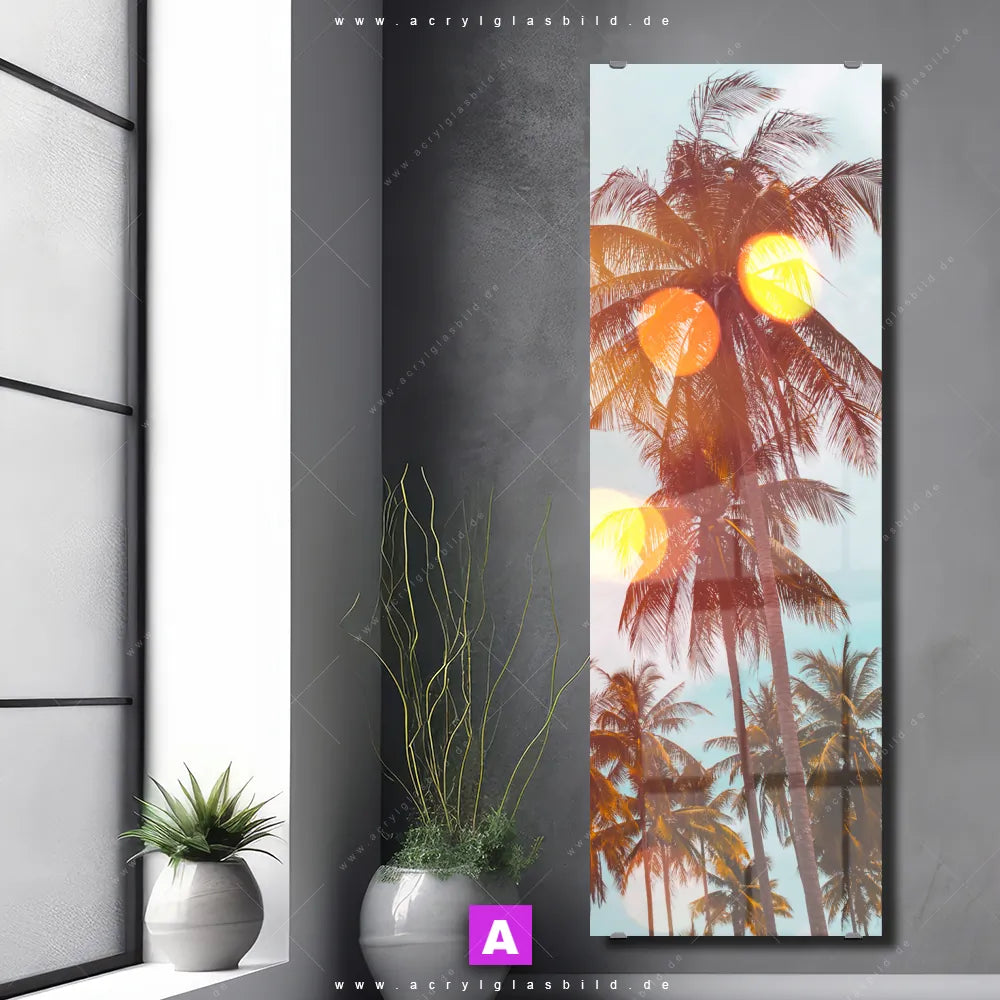 <b>Produktart:</b> Acrylglasbild | Glasbild | Wandbild aus Kunstglas | <b> Motiv:</b> Tropische Palmen | <b> Bildausrichtung:</b> Schmal | <b> Max. Motiv-Größe:</b> 450cm breit | 300cm hoch | <b> Verfügbare Formate: </b> Quadrat, Querformat, Hochformat, Panorama, Schmal, Rund | <b> Kategorie:</b>  Landschaften, Strand - Meer | <b> Farben:</b>  Mint, Braun, Orange | <b> Kunstformen:</b>  Fotografie | <b> Kunststile:</b>  Natürlich - Realistisch, Modern Art, Retro - Vintage