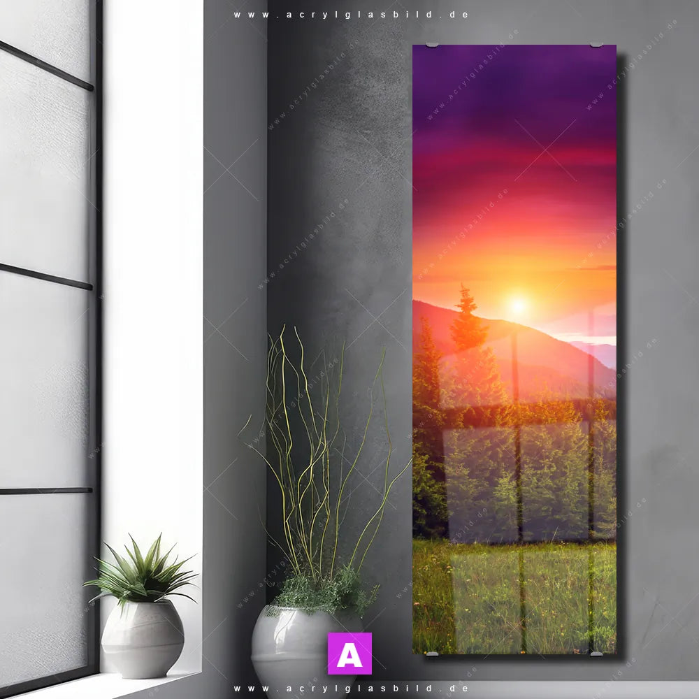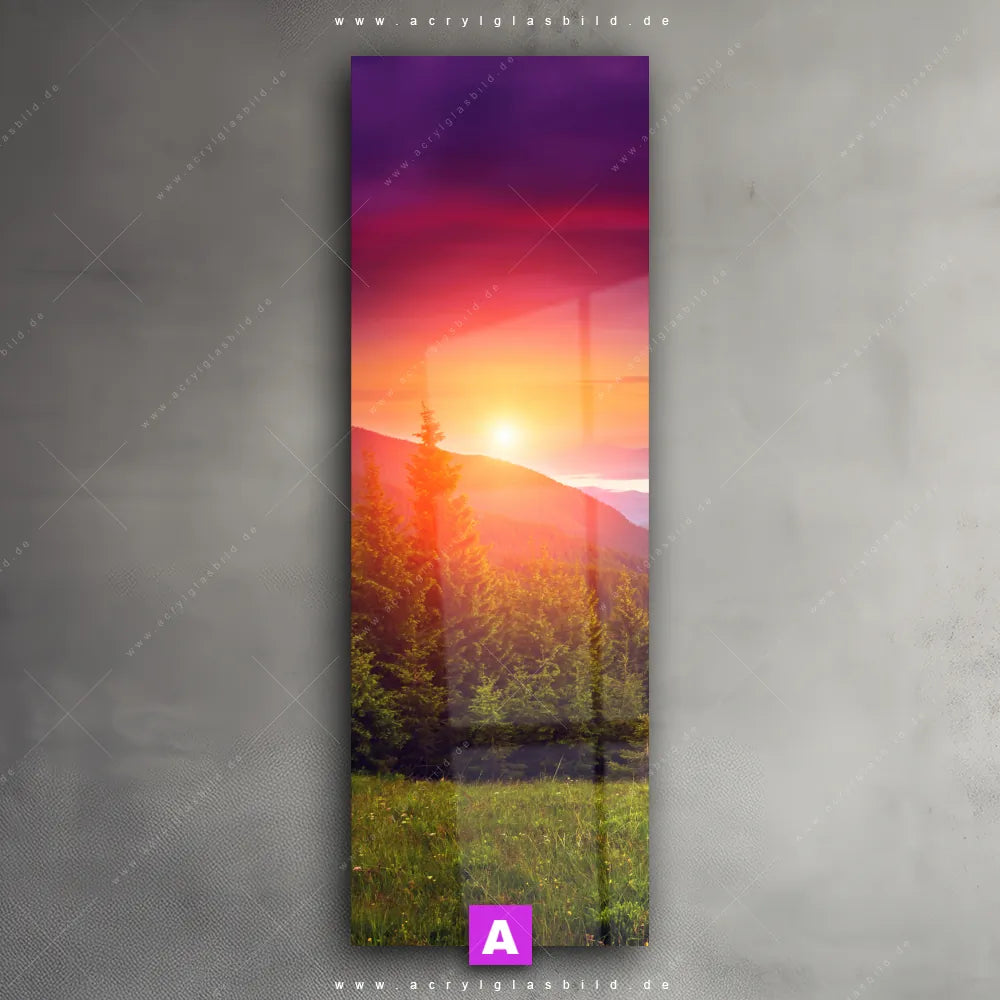 <b>Produktart:</b> Acrylglasbild | Glasbild | Wandbild aus Kunstglas | <b> Motiv:</b> Wald bei Sonnenuntergang | <b> Bildausrichtung:</b> Schmal | <b> Max. Motiv-Größe:</b> 224cm breit | 180cm hoch | <b> Verfügbare Formate: </b> Quadrat, Querformat, Hochformat, Panorama, Schmal, Rund | <b> Kategorie:</b> Landschaften, Wald - Bäume | <b> Farben:</b> Grün, Orange, Lila | <b> Kunstformen:</b> Fotografie | <b> Kunststile:</b> Natürlich - Realistisch