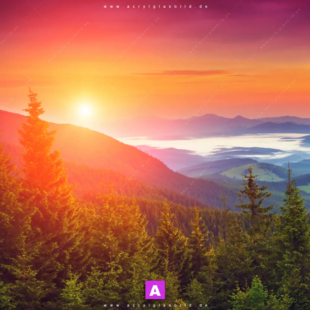 Die einzigartigen Farben in Grün, Orange, Lila machen das Acrylglasbild Sonnenuntergang über Waldlandschaft mit Wald, Landschaft, Bäume, Natur, Sonnenuntergang, Himmel, Tannen, Sonne zu einem echten Hingucker. Egal ob deine Einrichtung minimalistisch, modern oder doch eher wild und ausgefallen ist - unser Acrylglasbild Wald umhüllt von warmen Himmelsfarben im Natürlich - Realistisch Stil passt immer, auch in Arzt - Praxis, Bar - Gastronomie, Büro - Kanzlei, Flur - Eingangsbereich, Wohnzimmer - Schlafzimmer.