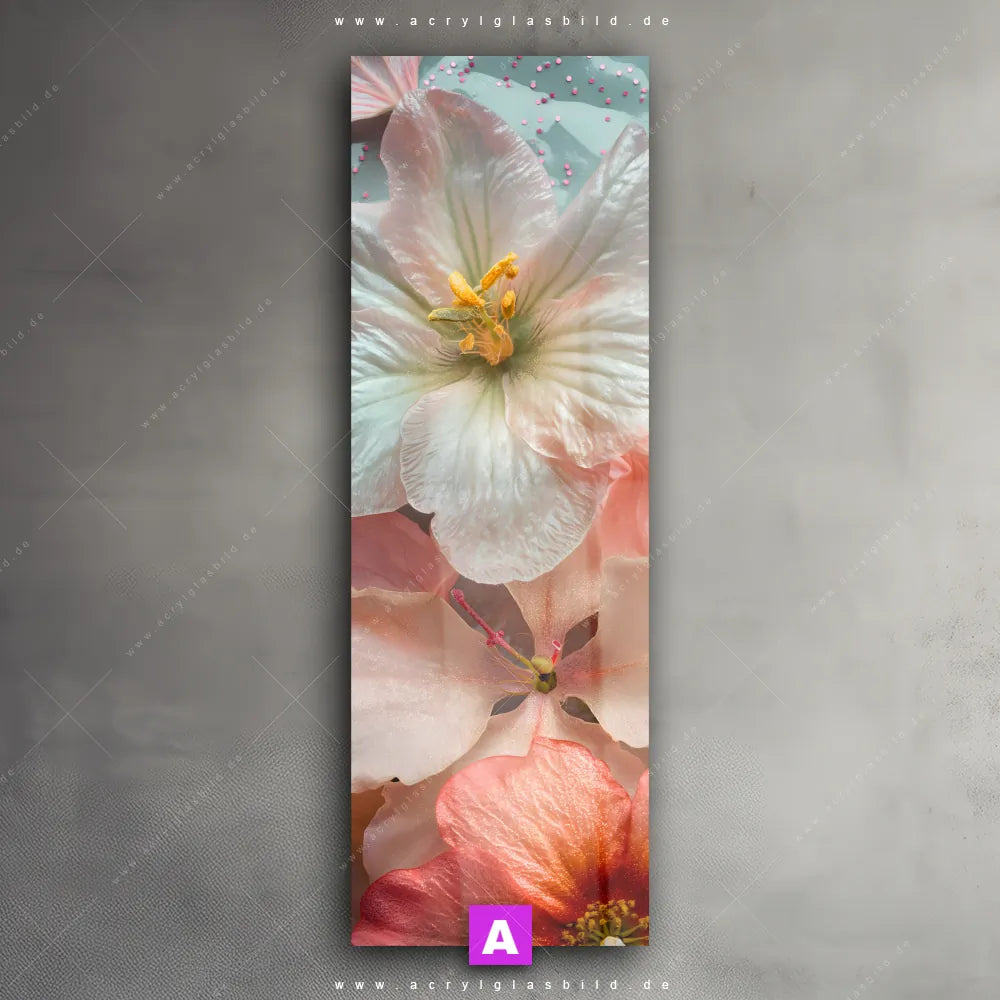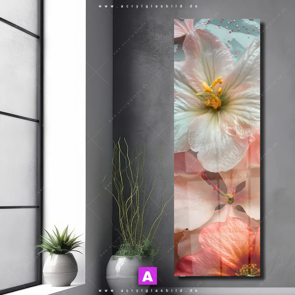 <b>Produktart:</b> Acrylglasbild | Glasbild | Wandbild aus Kunstglas | <b> Motiv:</b> Zarte Blütenpracht | <b> Bildausrichtung:</b> Schmal | <b> Max. Motiv-Größe:</b> 300cm breit | 450cm hoch | <b> Verfügbare Formate: </b> Quadrat, Querformat, Hochformat, Panorama, Schmal, Rund | <b> Kategorie:</b> Blumen - Botanik | <b> Farben:</b> Rosa, Weiss, Türkis | <b> Kunstformen:</b> Digitale Kunst, Fotografie | <b> Kunststile:</b> Floral, Natürlich - Realistisch