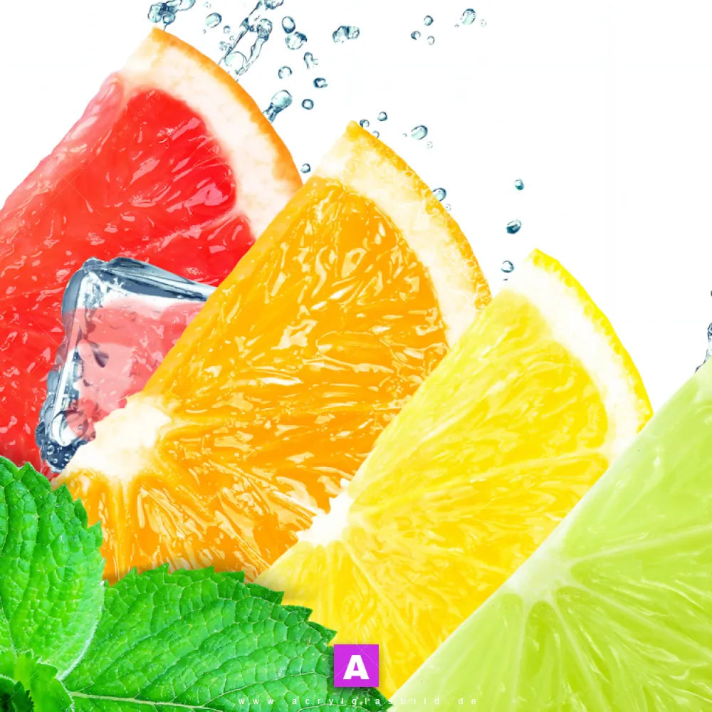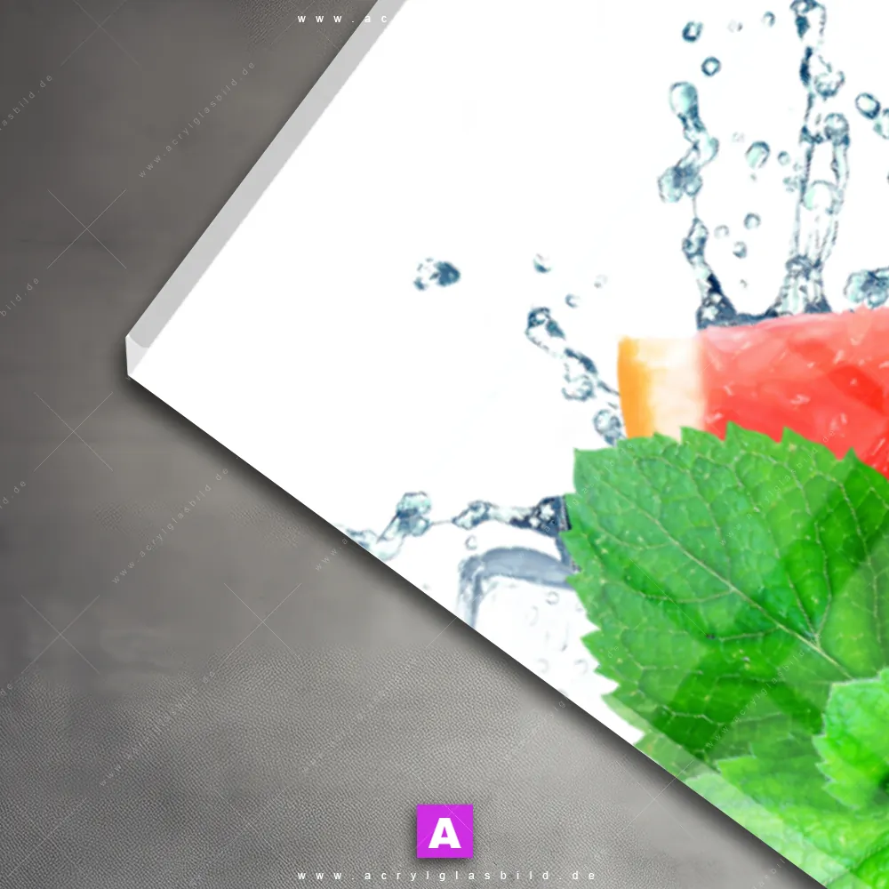 Die einzigartigen Farben in Grün, Orange, Rot, Weiss machen das Acrylglasbild Minze mit Zitrusfrüchten mit Obst, Zitrusfrüchte, Früchte, Eiswürfel, Zitrone, frisch, spritzig, Limette, Grapefruit, Orange zu einem echten Hingucker. Egal ob deine Einrichtung minimalistisch, modern oder doch eher wild und ausgefallen ist - unser Acrylglasbild Eiswürfel mit Scheiben von Zitrusfrüchten im Mixed Media, Modern Art Stil passt immer, auch in Bar - Gastronomie, Küche - Esszimmer.