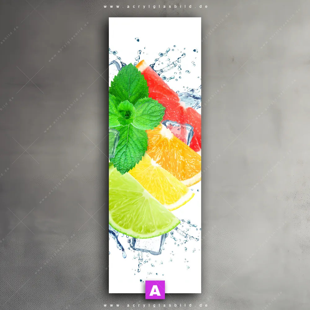 <b>Produktart:</b> Acrylglasbild | Glasbild | Wandbild aus Kunstglas | <b> Motiv:</b> Zitrusfrüchte auf Eis | <b> Bildausrichtung:</b> Schmal | <b> Max. Motiv-Größe:</b> 240cm breit | 180cm hoch | <b> Verfügbare Formate: </b> Quadrat, Querformat, Hochformat, Panorama, Schmal, Rund | <b> Kategorie:</b> Essen - Trinken | <b> Farben:</b> Grün, Orange, Rot, Weiss | <b> Kunstformen:</b> Fotografie, Digitale Kunst | <b> Kunststile:</b> Mixed Media, Modern Art
