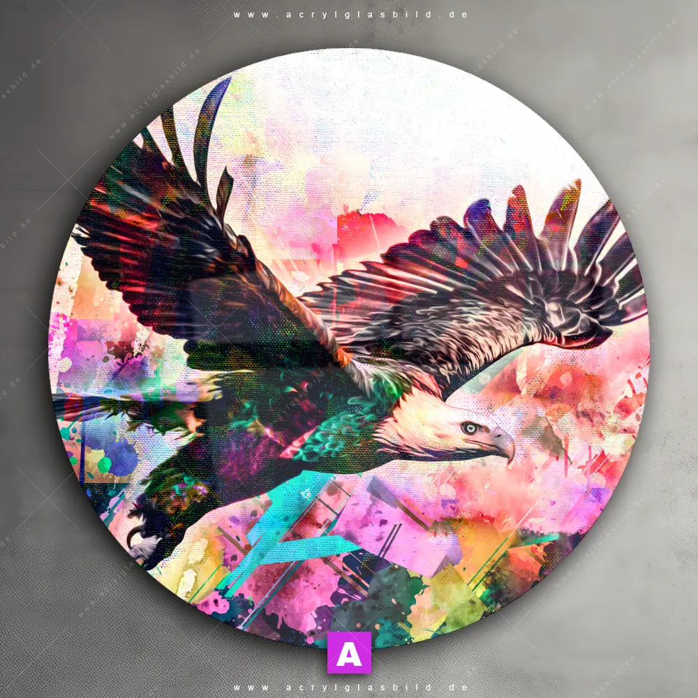 <b>Produktart:</b> Acrylglasbild | Glasbild | Wandbild aus Kunstglas | <b> Motiv:</b> Abstrakter Adler | <b> Bildausrichtung:</b> Rund | <b> Max. Motiv-Größe:</b> 300cm breit | 210cm hoch | <b> Verfügbare Formate: </b> Quadrat, Querformat, Hochformat, Panorama, Schmal, Rund | <b> Kategorie:</b> Tierwelt | <b> Farben:</b> Bunt | <b> Kunstformen:</b> Kunst - Malerei | <b> Kunststile:</b> Abstrakt, Grunge, Mixed Media, Modern Art, Pop Art, Street Art