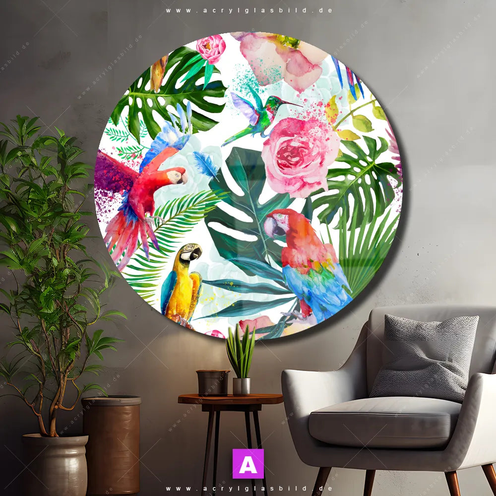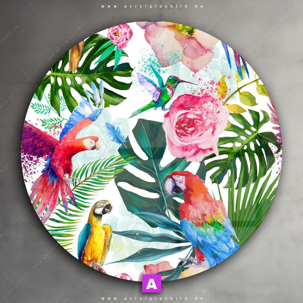 Hey du! Bist du es auch leid, auf langweilige, weiße Wände in deinem Raum zu starren und dich zu fragen, ob das der Sinn des Lebens ist? Unser Acrylglasbild mit dem Titel Blumen & Papageien Aquarell im Format Rund verwandelt deine Wand in ein Kunstwerk und macht deinen Raum zum absoluten Hingucker.