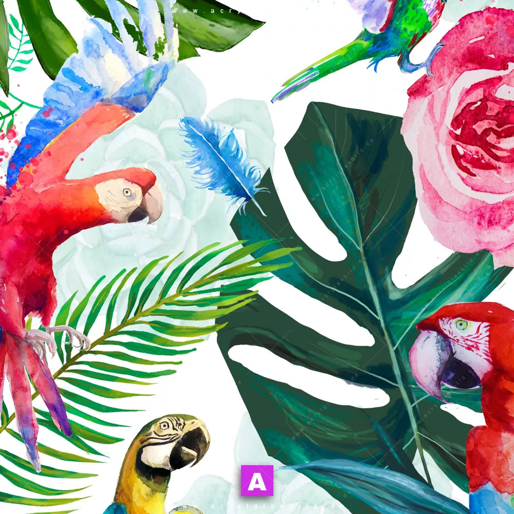 <b>Produktart:</b> Acrylglasbild | Glasbild | Wandbild aus Kunstglas | <b> Motiv:</b> Blumen & Papageien Aquarell | <b> Bildausrichtung:</b> Rund | <b> Max. Motiv-Größe:</b> 300cm breit | 300cm hoch | <b> Verfügbare Formate: </b> Quadrat, Querformat, Hochformat, Panorama, Schmal, Rund | <b> Kategorie:</b> Tierwelt, Blumen - Botanik | <b> Farben:</b> Bunt, Grün, Blau, Braun, Gelb , Hellblau, Hellgrün, Lila, Orange, Ocker, Rot, Türkis | <b> Kunstformen:</b> Digitale Kunst, Kunst - Malerei | <b> Kunststile:</b> Modern Art, Floral