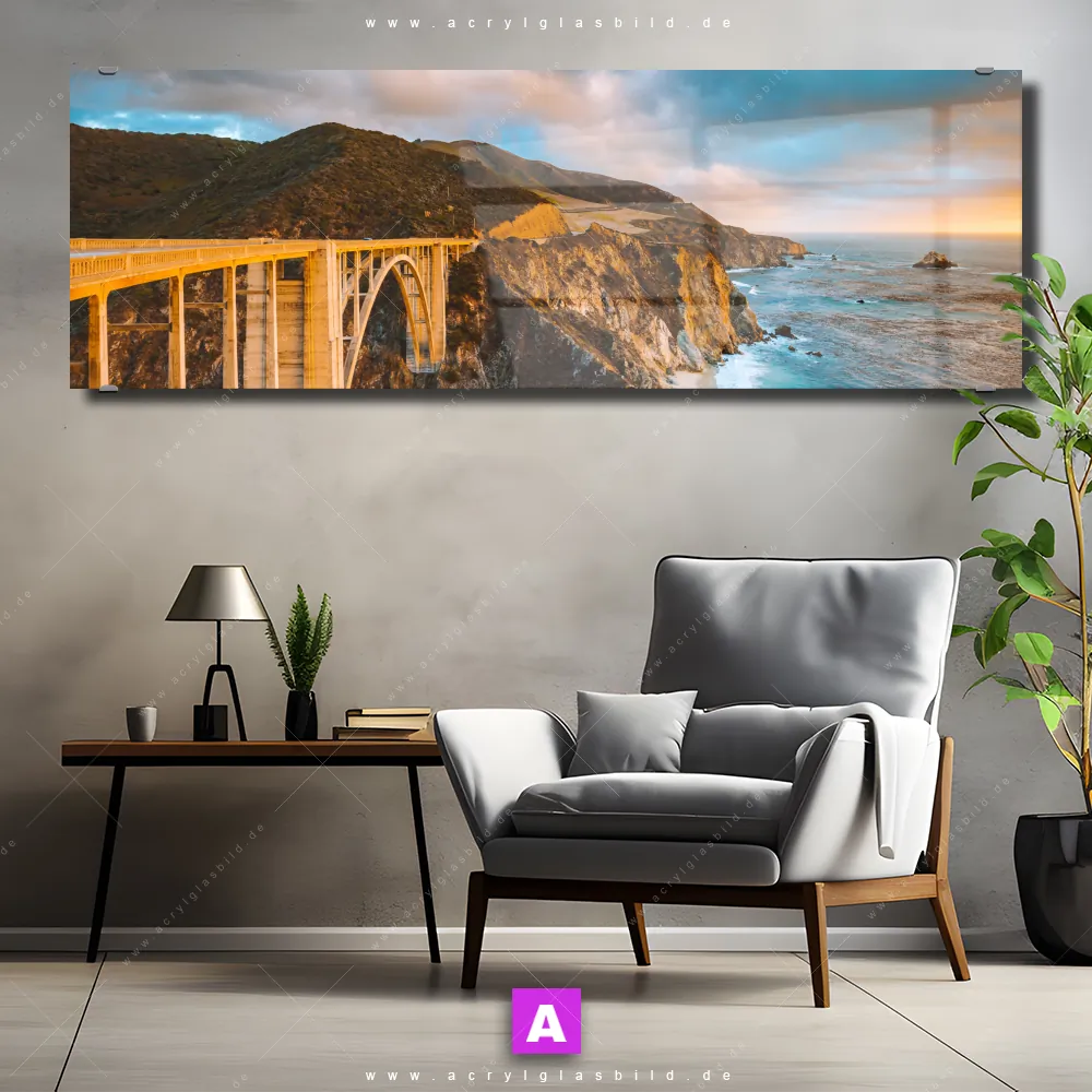 Das Motiv Brücke an der Küste wird im UV-Direktdruck in den Farben Blau, Orange, Hellblau auf die Rückseite einer 5mm starken, transparenten Acrylglasplatte gedruckt. Das durchscheinende Motiv Straßen am Meer im Natürlich - Realistisch Stil wird anschließend vollflächig mit einer weißen Schicht hinterlegt. Das Landschaften Acrylglasbild | Panorama erhält so eine bemerkenswerte Farbbrillanz, hohe Schärfe und erstaunliche Tiefenwirkung.