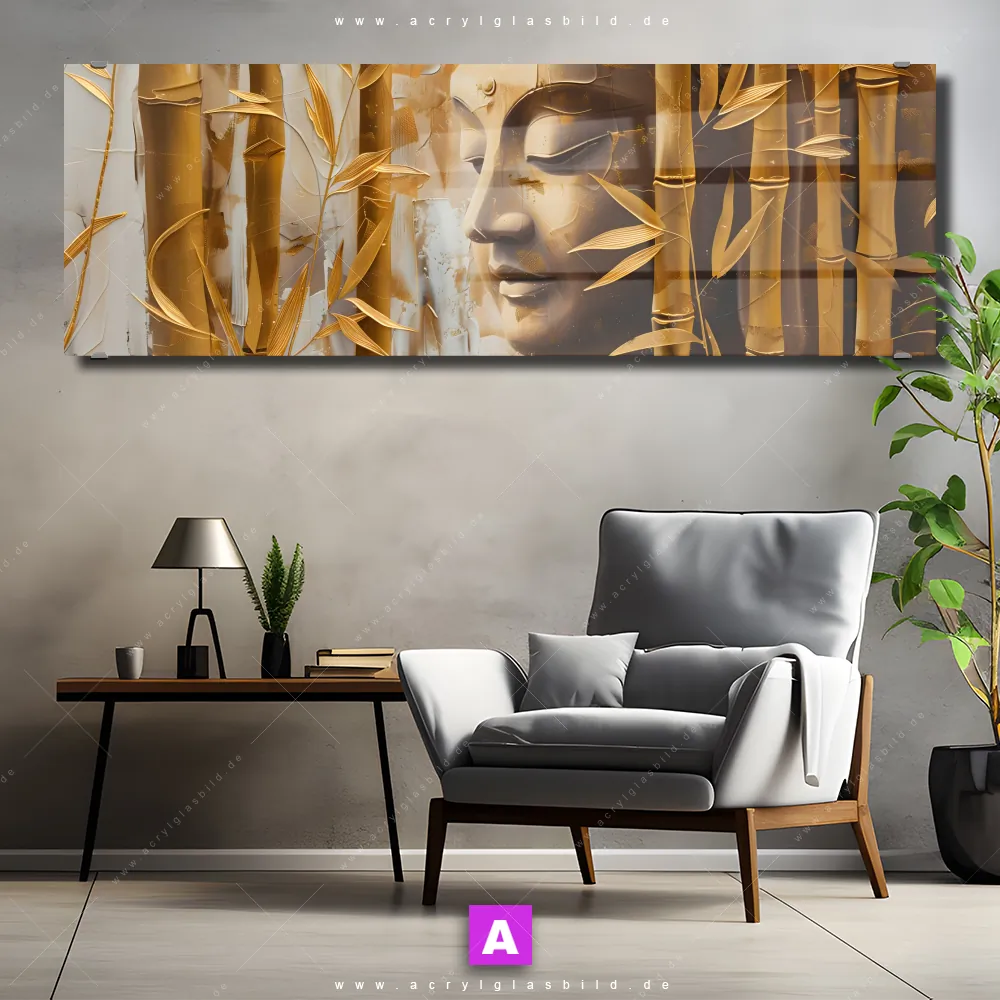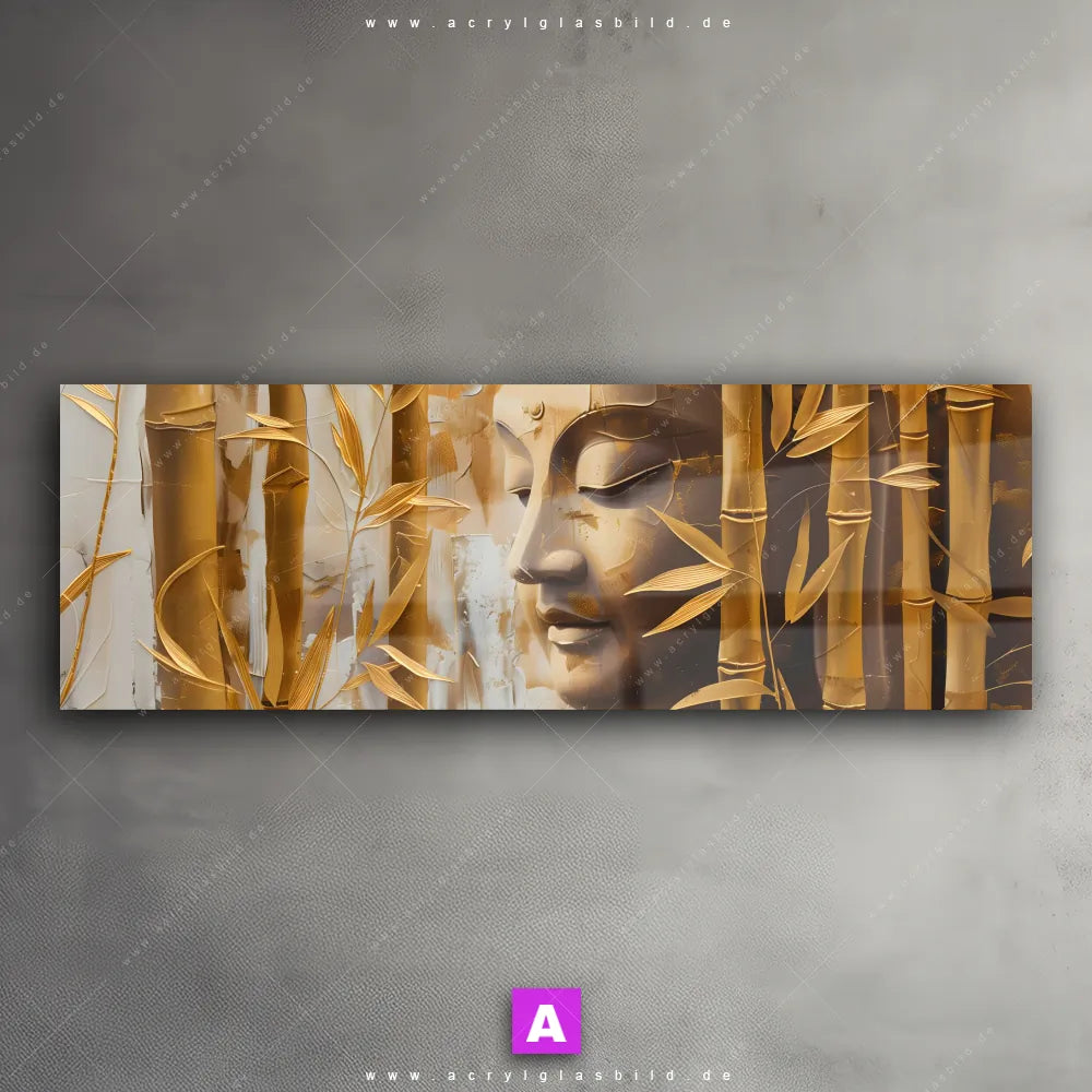 <b>Produktart:</b> Acrylglasbild | Glasbild | Wandbild aus Kunstglas | <b> Motiv:</b> Buddha-Statue im goldenen Bambus | <b> Bildausrichtung:</b> Panorama | <b> Max. Motiv-Größe:</b> 450cm breit | 300cm hoch | <b> Verfügbare Formate: </b> Quadrat, Querformat, Hochformat, Panorama, Schmal, Rund | <b> Kategorie:</b> Buddha - Feng Shui | <b> Farben:</b> Gold, Beige, Braun | <b> Kunstformen:</b> Kunst - Malerei | <b> Kunststile:</b> Abstrakt, Mixed Media