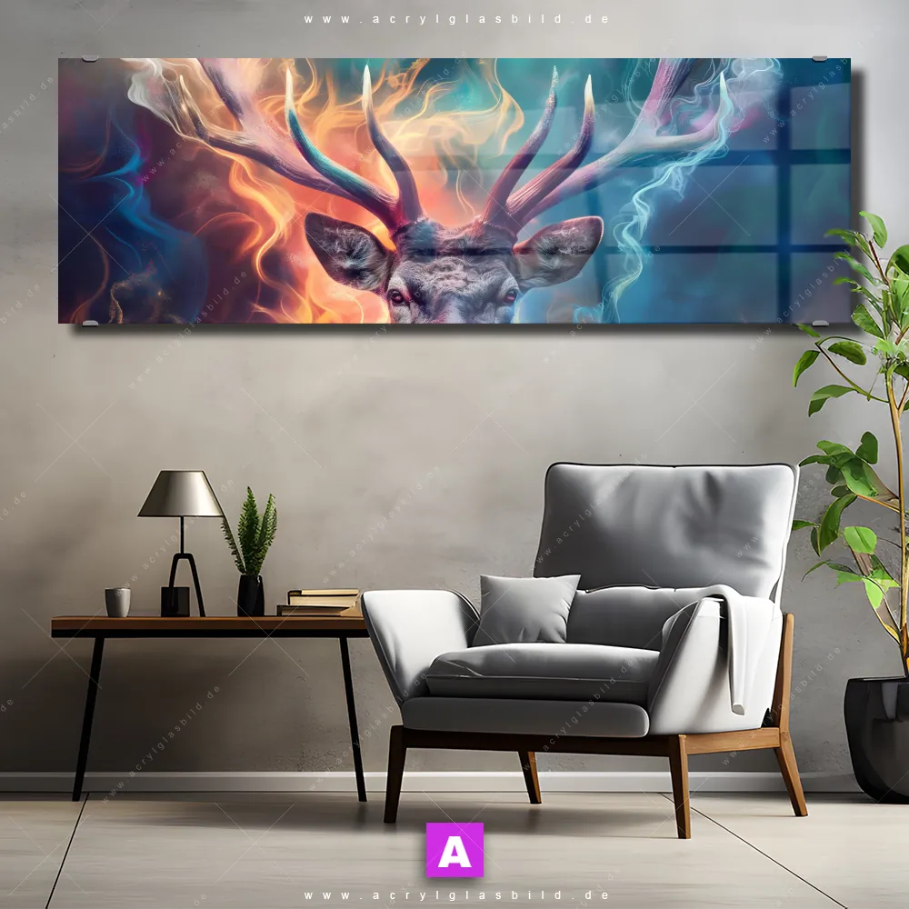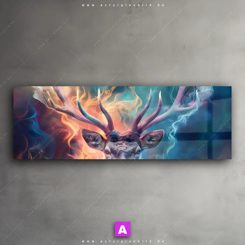 Acrylglasbild | Bunter Hirsch in Flammen | Panorama