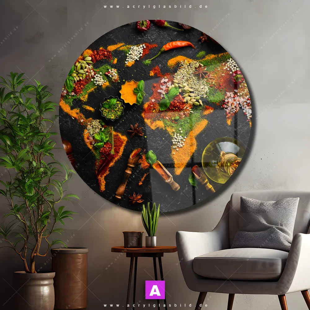 <b>Produktart:</b> Acrylglasbild | Glasbild | Wandbild aus Kunstglas | <b> Motiv:</b> Die Weltkarte der Gewürze | <b> Bildausrichtung:</b> Rund | <b> Max. Motiv-Größe:</b> 450cm breit | 300cm hoch | <b> Verfügbare Formate: </b> Quadrat, Querformat, Hochformat, Panorama, Schmal, Rund | <b> Kategorie:</b> Essen - Trinken | <b> Farben:</b> Braun, Bunt, Beige, Weiss, Gelb , Grau , Grün, Hellblau, Hellgrün, Mint, Ocker, Orange, Rot, Rosa | <b> Kunstformen:</b> Fotografie | <b> Kunststile:</b> Natürlich - Realistisch