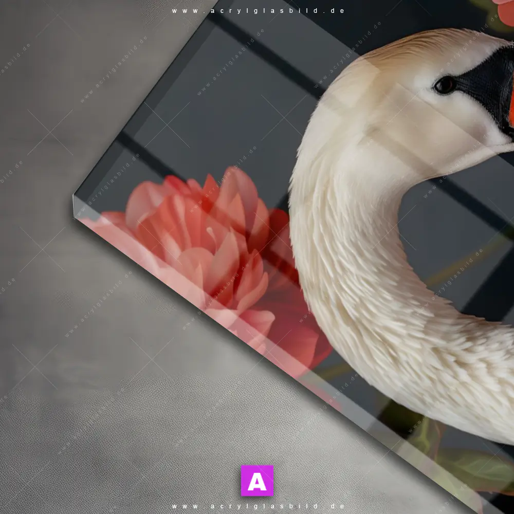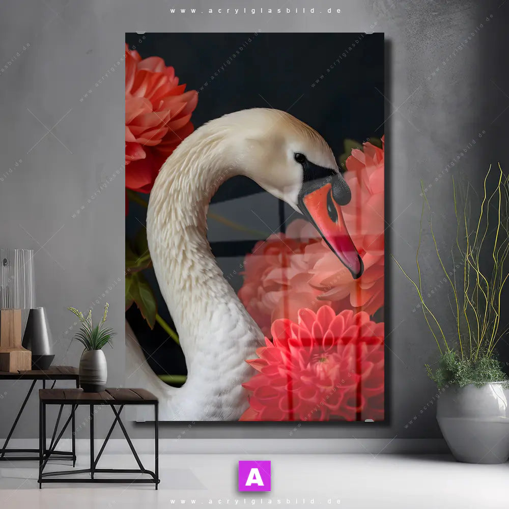 Hallo, auf Wiedersehen langweilige Wände! Gib deinem Raum ein stilvolles Upgrade mit unserem Acrylglasbild Eleganter Schwan mit Blumen im Hochformat, das nicht nur Wohnzimmer - Schlafzimmer, Arzt - Praxis, Flur - Eingangsbereich, sondern auch jeden anderen Raum im Handumdrehen auf ein neues Niveau hebt!