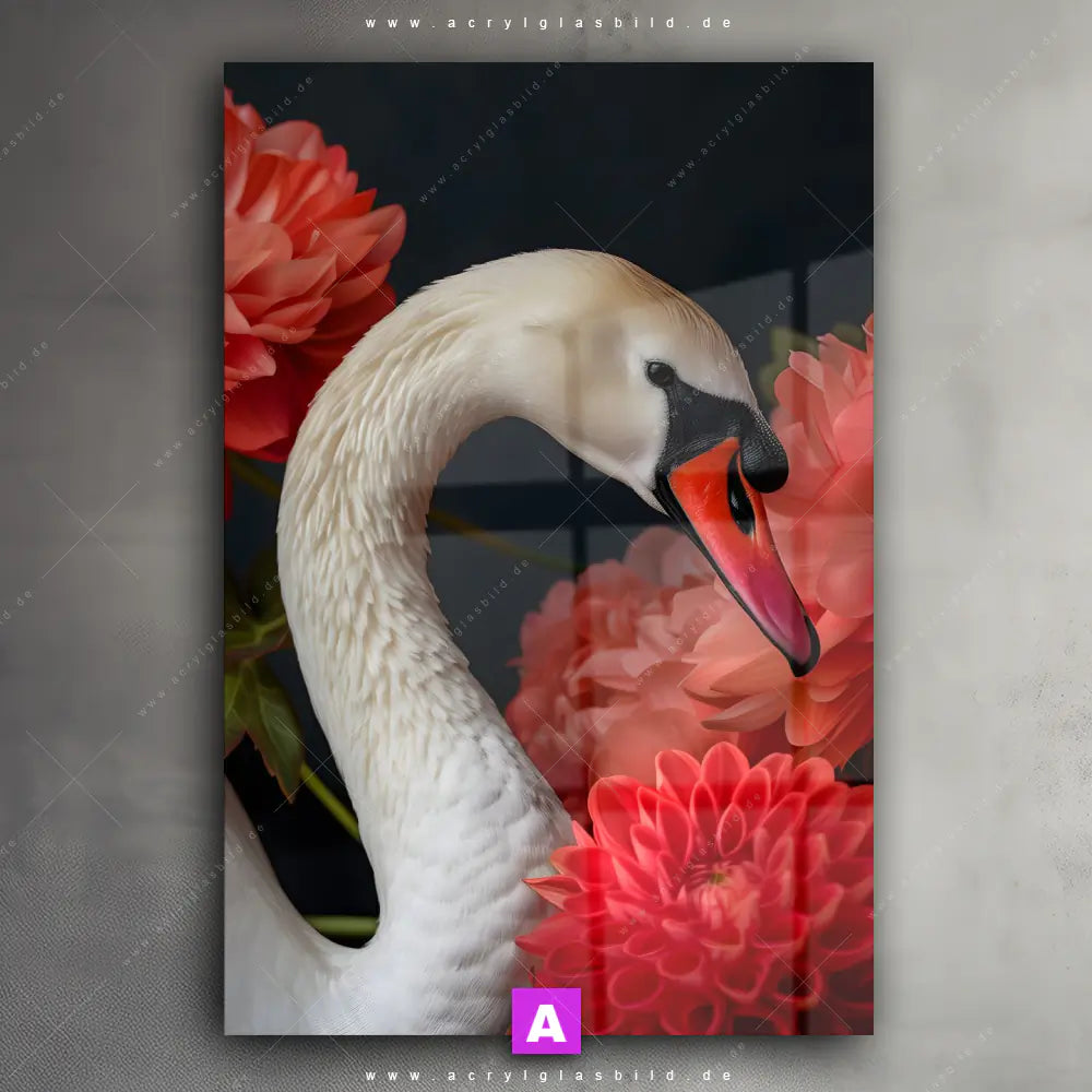 <b>Produktart:</b> Acrylglasbild | Glasbild | Wandbild aus Kunstglas | <b> Motiv:</b> Eleganter Schwan mit Blumen | <b> Bildausrichtung:</b> Hochformat | <b> Max. Motiv-Größe:</b> 360cm breit | 240cm hoch | <b> Verfügbare Formate: </b> Quadrat, Querformat, Hochformat, Panorama, Schmal, Rund | <b> Kategorie:</b> Tierwelt, Blumen - Botanik | <b> Farben:</b> Weiss, Rot, Schwarz | <b> Kunstformen:</b> Digitale Kunst, KI-generiertes Bild | <b> Kunststile:</b> Floral, Natürlich - Realistisch