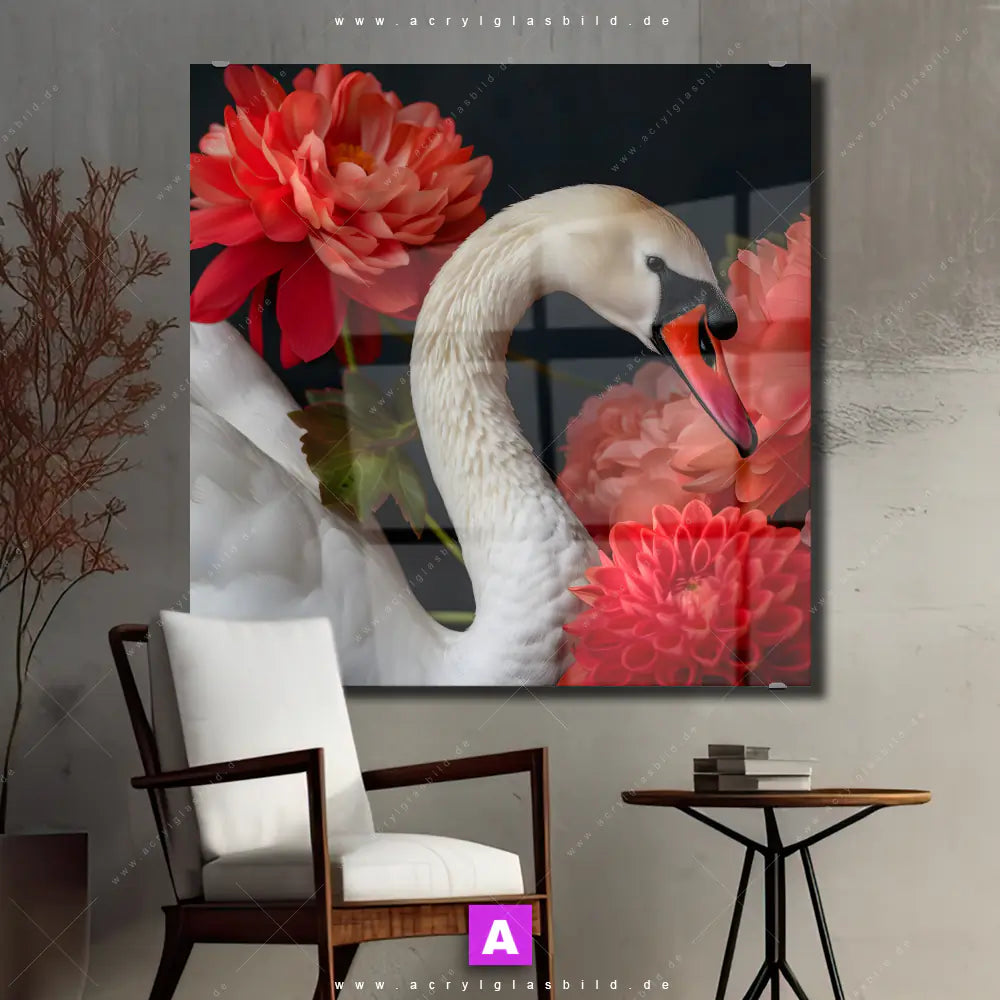 Acrylglasbild | Eleganter Schwan mit Blumen | Quadrat