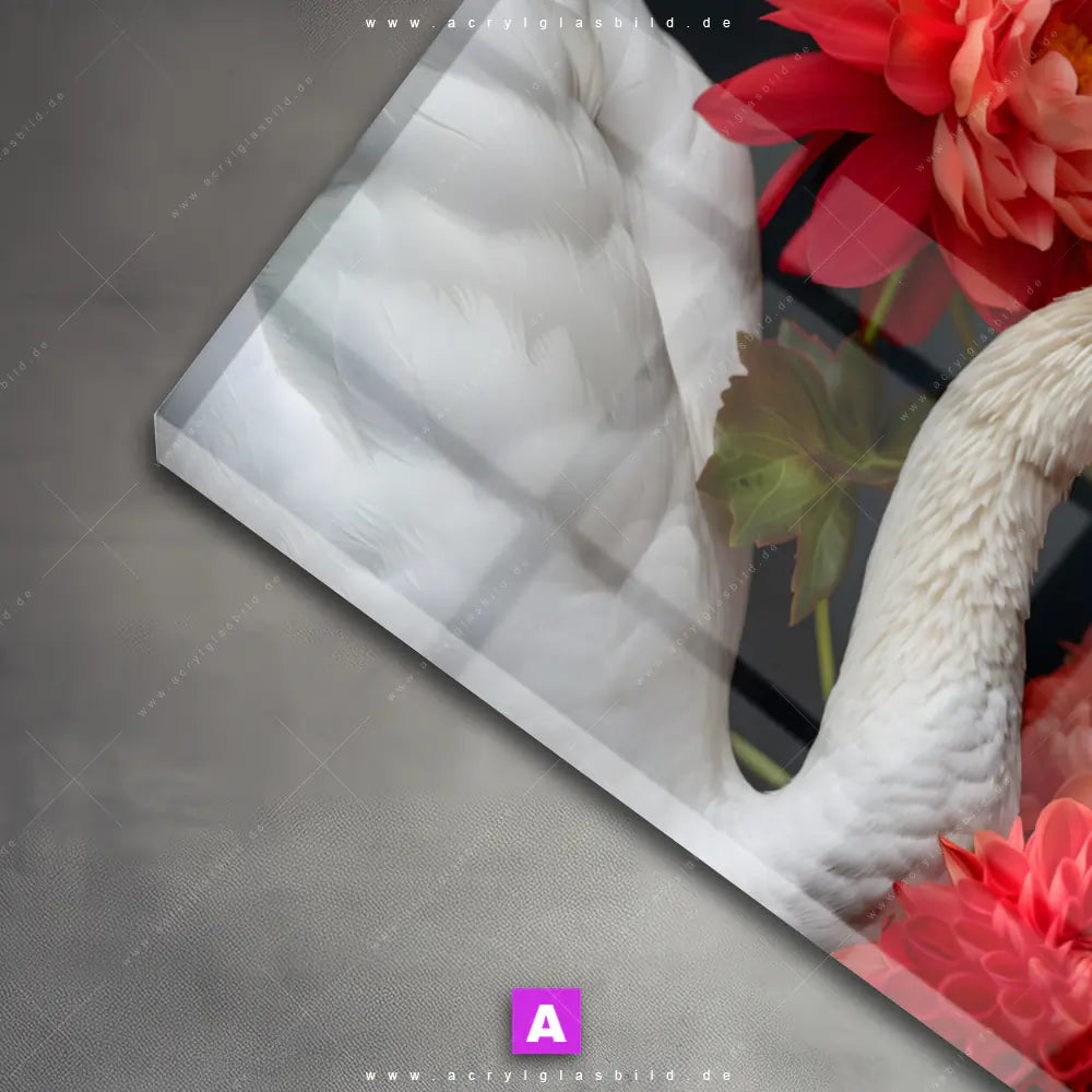 <b>Produktart:</b> Acrylglasbild | Glasbild | Wandbild aus Kunstglas | <b> Motiv:</b> Eleganter Schwan mit Blumen | <b> Bildausrichtung:</b> Querformat | <b> Max. Motiv-Größe:</b> 360cm breit | 240cm hoch | <b> Verfügbare Formate: </b> Quadrat, Querformat, Hochformat, Panorama, Schmal, Rund | <b> Kategorie:</b> Tierwelt, Blumen - Botanik | <b> Farben:</b> Weiss, Rot, Schwarz | <b> Kunstformen:</b> Digitale Kunst, KI-generiertes Bild | <b> Kunststile:</b> Floral, Natürlich - Realistisch