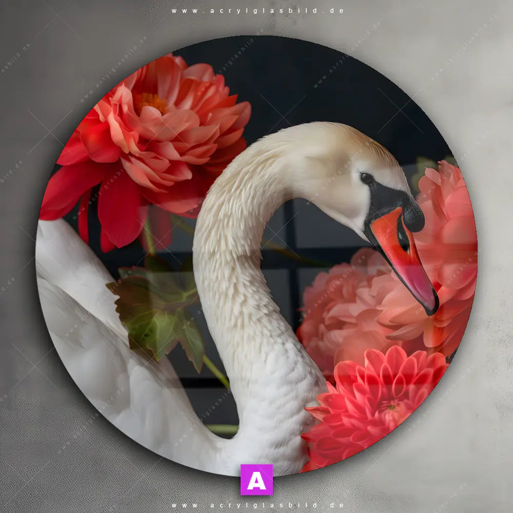 <b>Produktart:</b> Acrylglasbild | Glasbild | Wandbild aus Kunstglas | <b> Motiv:</b> Eleganter Schwan mit Blumen | <b> Bildausrichtung:</b> Rund | <b> Max. Motiv-Größe:</b> 360cm breit | 240cm hoch | <b> Verfügbare Formate: </b> Quadrat, Querformat, Hochformat, Panorama, Schmal, Rund | <b> Kategorie:</b> Tierwelt, Blumen - Botanik | <b> Farben:</b> Weiss, Rot, Schwarz | <b> Kunstformen:</b> Digitale Kunst, KI-generiertes Bild | <b> Kunststile:</b> Floral, Natürlich - Realistisch