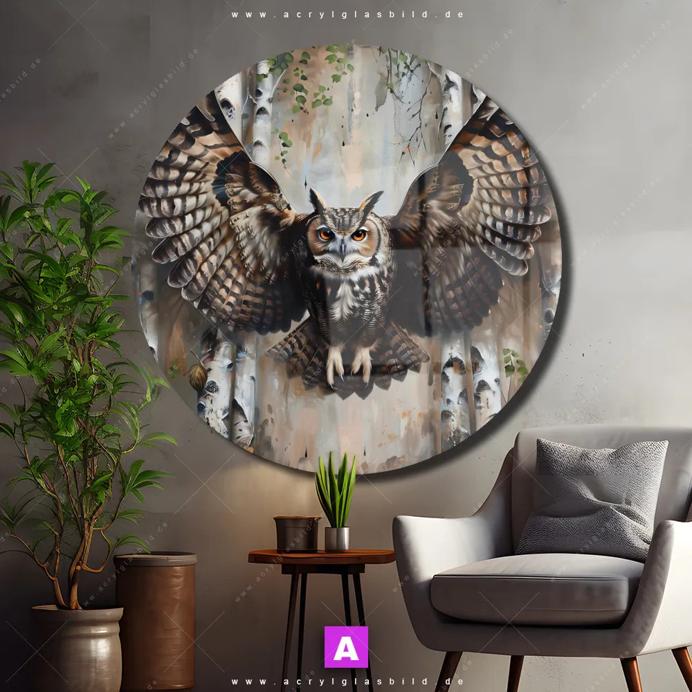 <b>Produktart:</b> Acrylglasbild | Glasbild | Wandbild aus Kunstglas | <b> Motiv:</b> Eule im Birkenwald | <b> Bildausrichtung:</b> Rund | <b> Max. Motiv-Größe:</b> 450cm breit | 300cm hoch | <b> Verfügbare Formate: </b> Quadrat, Querformat, Hochformat, Panorama, Schmal, Rund | <b> Kategorie:</b> Tierwelt, Wald - Bäume | <b> Farben:</b> Braun, Beige, Weiss | <b> Kunstformen:</b> Kunst - Malerei | <b> Kunststile:</b> Retro - Vintage, Surreal - Fantasy