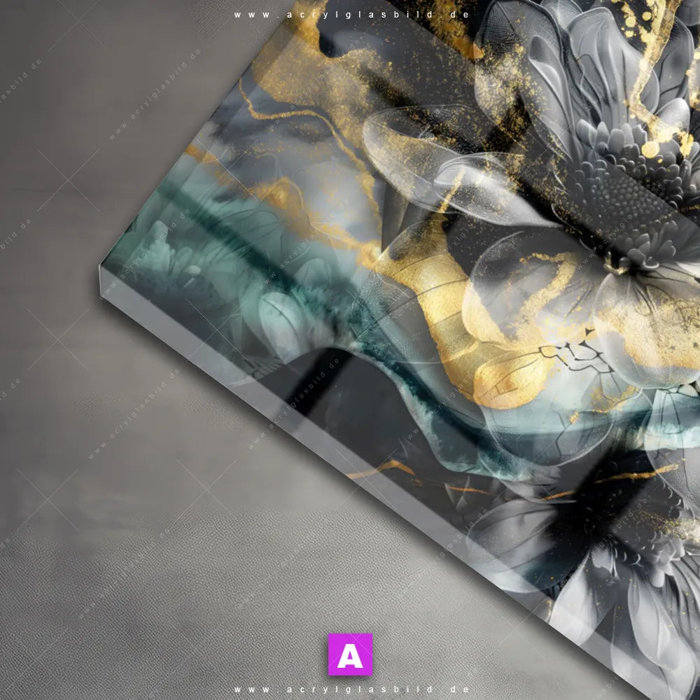 <b>Produktart:</b> Acrylglasbild | Glasbild | Wandbild aus Kunstglas | <b> Motiv:</b> Fluid Art - Duftende Blüten | <b> Bildausrichtung:</b> Querformat | <b> Max. Motiv-Größe:</b> 300cm breit | 200cm hoch | <b> Verfügbare Formate: </b> Quadrat, Querformat, Hochformat, Panorama, Schmal, Rund | <b> Kategorie:</b> Blumen - Botanik, Muster - Texturen | <b> Farben:</b> Schwarz, Grau , Gold, Türkis | <b> Kunstformen:</b> Digitale Kunst, Kunst - Malerei | <b> Kunststile:</b> Abstrakt, Floral, Modern Art