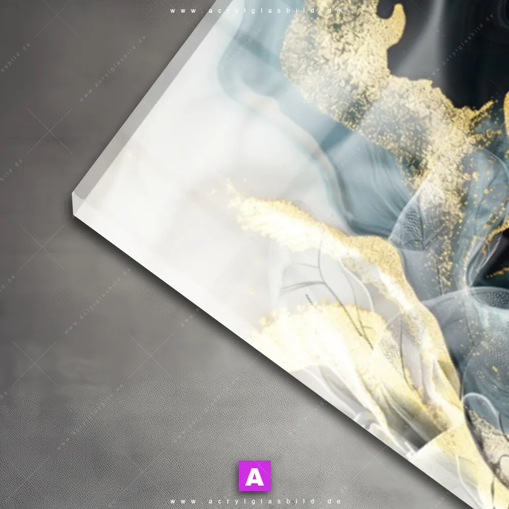 Das Motiv Fluid Art - Duftende Blüten wird im UV-Direktdruck in den Farben Schwarz, Grau , Gold, Türkis auf die Rückseite einer 5mm starken, transparenten Acrylglasplatte gedruckt. Das durchscheinende Motiv Florales abstraktes Design im Abstrakt, Floral, Modern Art Stil wird anschließend vollflächig mit einer weißen Schicht hinterlegt. Das Blumen - Botanik, Muster - Texturen Acrylglasbild | Schmal erhält so eine bemerkenswerte Farbbrillanz, hohe Schärfe und erstaunliche Tiefenwirkung.