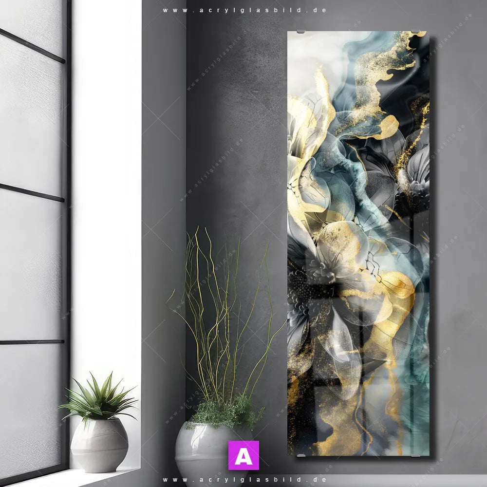 <b>Produktart:</b> Acrylglasbild | Glasbild | Wandbild aus Kunstglas | <b> Motiv:</b> Fluid Art - Duftende Blüten | <b> Bildausrichtung:</b> Schmal | <b> Max. Motiv-Größe:</b> 200cm breit | 300cm hoch | <b> Verfügbare Formate: </b> Quadrat, Querformat, Hochformat, Panorama, Schmal, Rund | <b> Kategorie:</b> Blumen - Botanik, Muster - Texturen | <b> Farben:</b> Schwarz, Grau , Gold, Türkis | <b> Kunstformen:</b> Digitale Kunst, Kunst - Malerei | <b> Kunststile:</b> Abstrakt, Floral, Modern Art