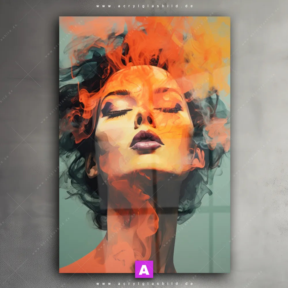 <b>Produktart:</b> Acrylglasbild | Glasbild | Wandbild aus Kunstglas | <b> Motiv:</b> Frau mit buntem Rauch | <b> Bildausrichtung:</b> Hochformat | <b> Max. Motiv-Größe:</b> 300cm breit | 375cm hoch | <b> Verfügbare Formate: </b> Quadrat, Querformat, Hochformat, Panorama, Schmal, Rund | <b> Kategorie:</b> Porträts - Menschen | <b> Farben:</b> Orange, Lila, Mint, Hellgrün | <b> Kunstformen:</b> KI-generiertes Bild, Digitale Kunst | <b> Kunststile:</b> Modern Art, Abstrakt, Surreal - Fantasy