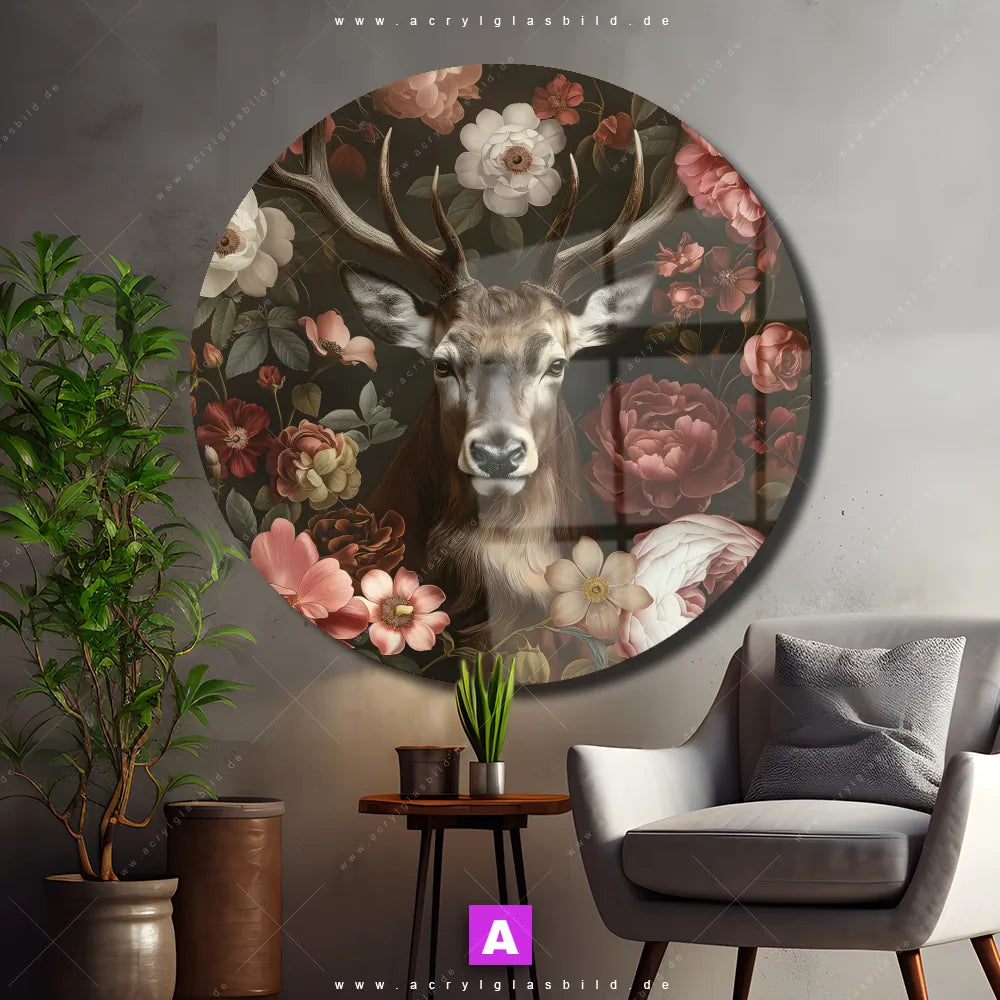Acrylglasbild | Friedlicher Hirsch und Blüten | Rund