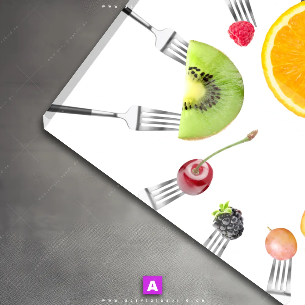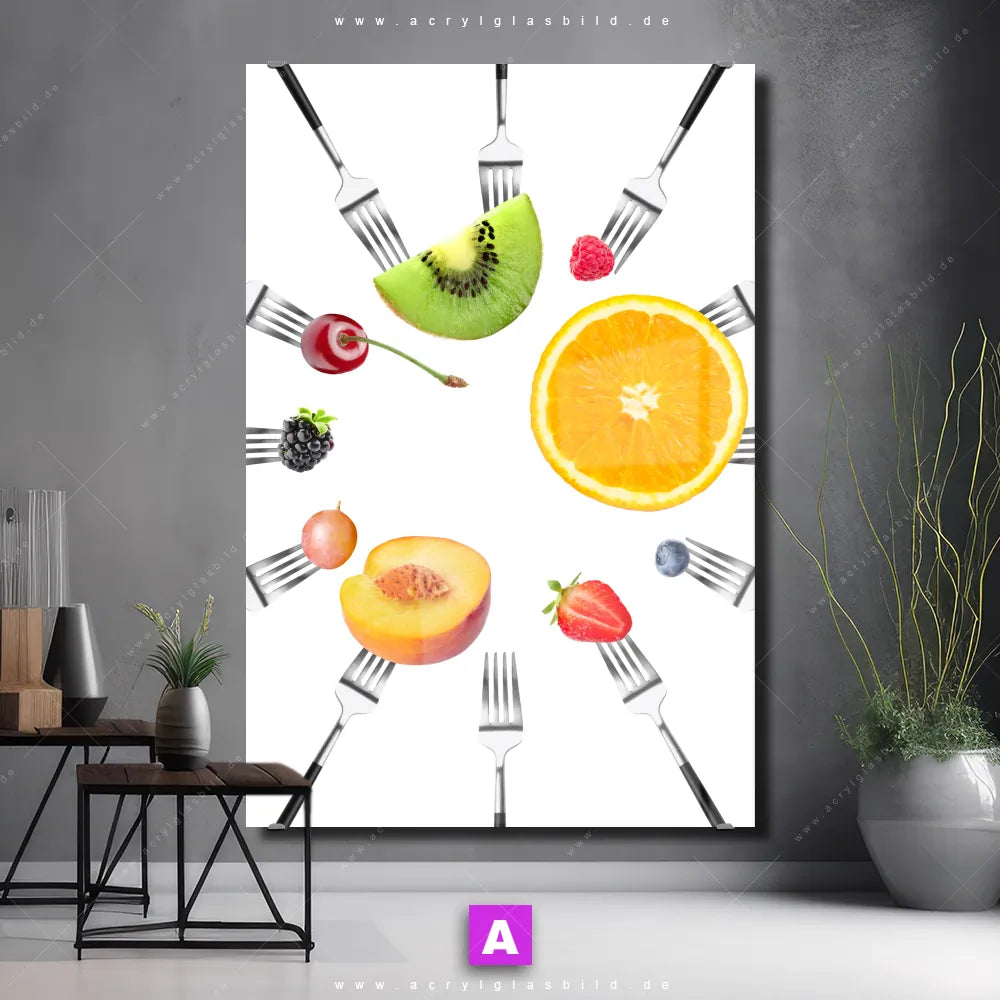 Hallo, auf Wiedersehen langweilige Wände! Gib deinem Raum ein stilvolles Upgrade mit unserem Acrylglasbild Früchte auf Gabeln im Hochformat, das nicht nur Bar - Gastronomie, Küche - Esszimmer, sondern auch jeden anderen Raum im Handumdrehen auf ein neues Niveau hebt!