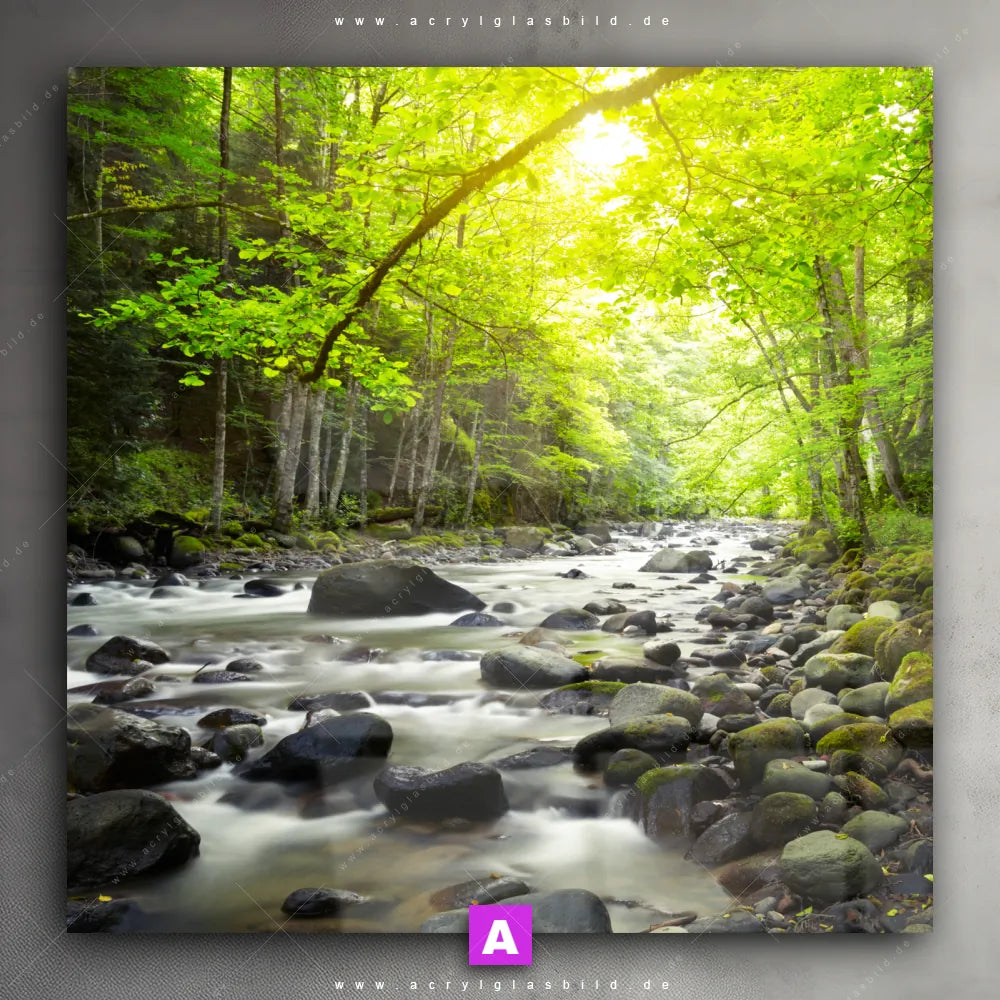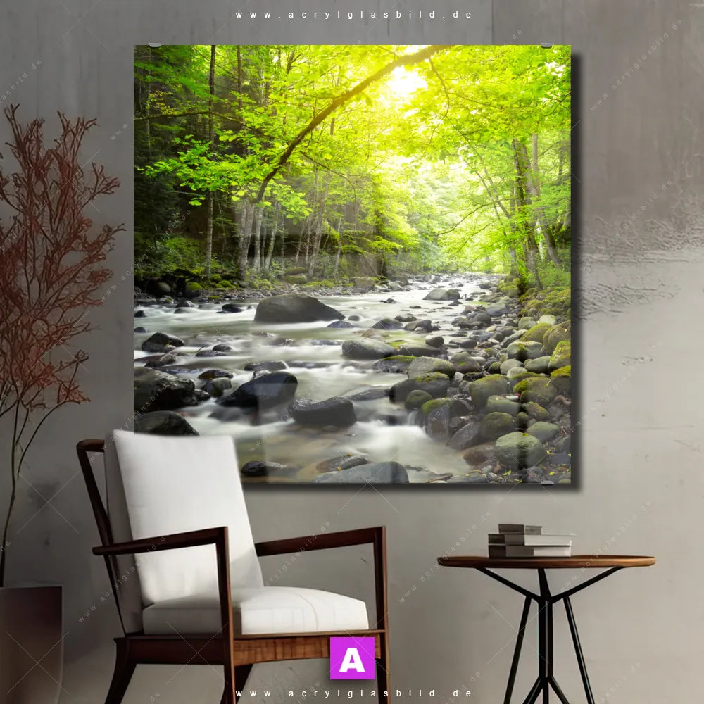 <b>Produktart:</b> Acrylglasbild | Glasbild | Wandbild aus Kunstglas | <b> Motiv:</b> Gebirgsfluss im Wald | <b> Bildausrichtung:</b> Quadrat | <b> Max. Motiv-Größe:</b> 270cm breit | 180cm hoch | <b> Verfügbare Formate: </b> Quadrat, Querformat, Hochformat, Panorama, Schmal, Rund | <b> Kategorie:</b>  Landschaften, Wald - Bäume | <b> Farben:</b>  Beige, Braun, Weiss, Gold, Gelb , Ocker, Hellgrün, Mint, Grün | <b> Kunstformen:</b>  Fotografie | <b> Kunststile:</b>  Natürlich - Realistisch