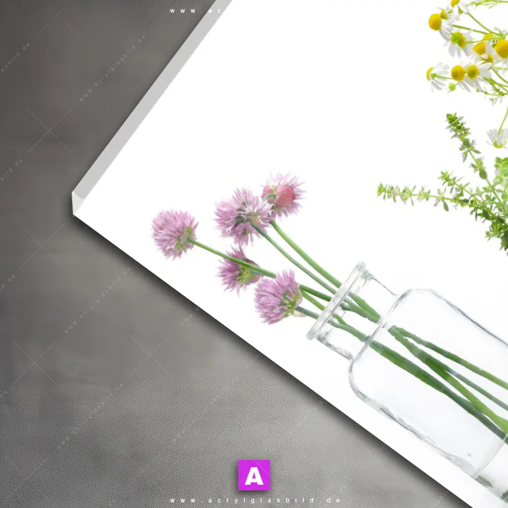 Das Motiv Glasvasen mit Kräutern wird im UV-Direktdruck in den Farben Weiss, Grün, Lila, Pink auf die Rückseite einer 5mm starken, transparenten Acrylglasplatte gedruckt. Das durchscheinende Motiv Kamille & andere Heilkräuter im Natürlich - Realistisch, Modern Art Stil wird anschließend vollflächig mit einer weißen Schicht hinterlegt. Das Essen - Trinken Acrylglasbild | Quadrat erhält so eine bemerkenswerte Farbbrillanz, hohe Schärfe und erstaunliche Tiefenwirkung.