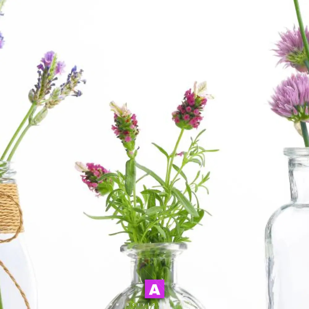 <b>Produktart:</b> Acrylglasbild | Glasbild | Wandbild aus Kunstglas | <b> Motiv:</b> Glasvasen mit Kräutern | <b> Bildausrichtung:</b> Quadrat | <b> Max. Motiv-Größe:</b> 500cm breit | 240cm hoch | <b> Verfügbare Formate: </b> Quadrat, Querformat, Hochformat, Panorama, Schmal, Rund | <b> Kategorie:</b>  Essen - Trinken | <b> Farben:</b>  Weiss, Grün, Lila, Pink | <b> Kunstformen:</b>  Fotografie | <b> Kunststile:</b>  Natürlich - Realistisch, Modern Art