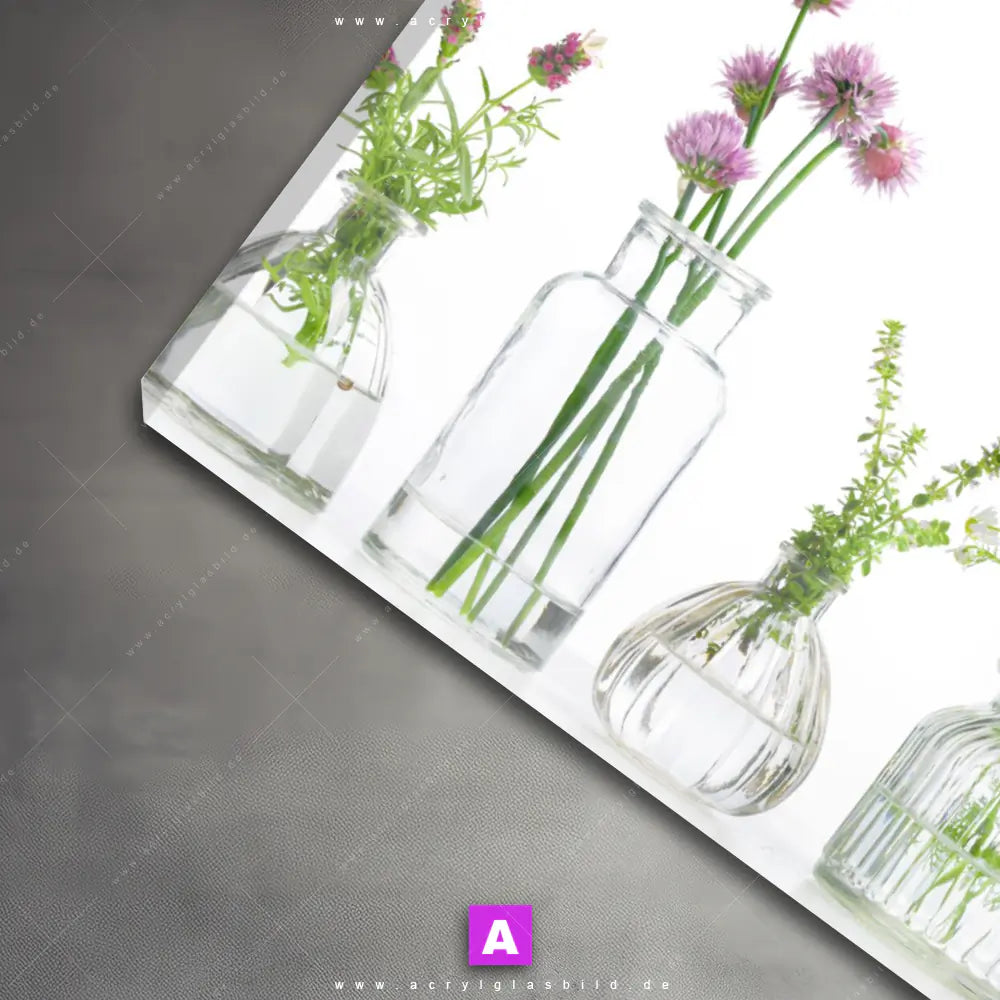 <b>Produktart:</b> Acrylglasbild | Glasbild | Wandbild aus Kunstglas | <b> Motiv:</b> Glasvasen mit Kräutern | <b> Bildausrichtung:</b> Querformat | <b> Max. Motiv-Größe:</b> 500cm breit | 240cm hoch | <b> Verfügbare Formate: </b> Quadrat, Querformat, Hochformat, Panorama, Schmal, Rund | <b> Kategorie:</b> Essen - Trinken | <b> Farben:</b> Weiss, Grün, Lila, Pink | <b> Kunstformen:</b> Fotografie | <b> Kunststile:</b> Natürlich - Realistisch, Modern Art
