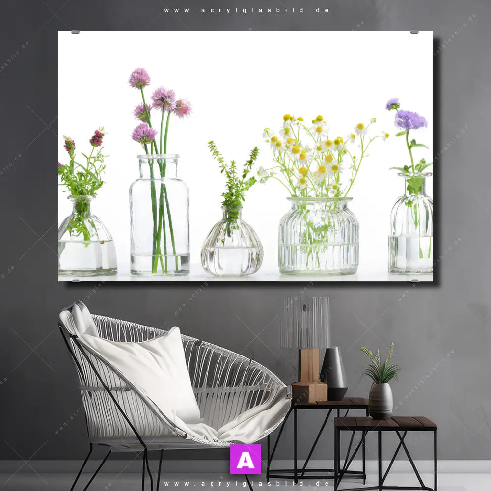 Hallo, du Meister der Dekoration oder Königin des Stils, bist du bereit, deine Räume, wie Bar - Gastronomie, Küche - Esszimmer, in einen kreativen Kunstsalon zu verwandeln? Dann haben wir das perfekte Wandkunstwerk für dich: Unser Acrylglasbild Glasvasen mit Kräutern im Querformat wird im Handumdrehen jeden Raum auf ein neues Level heben!