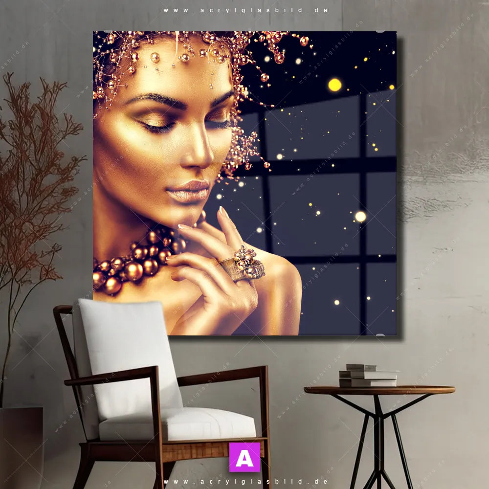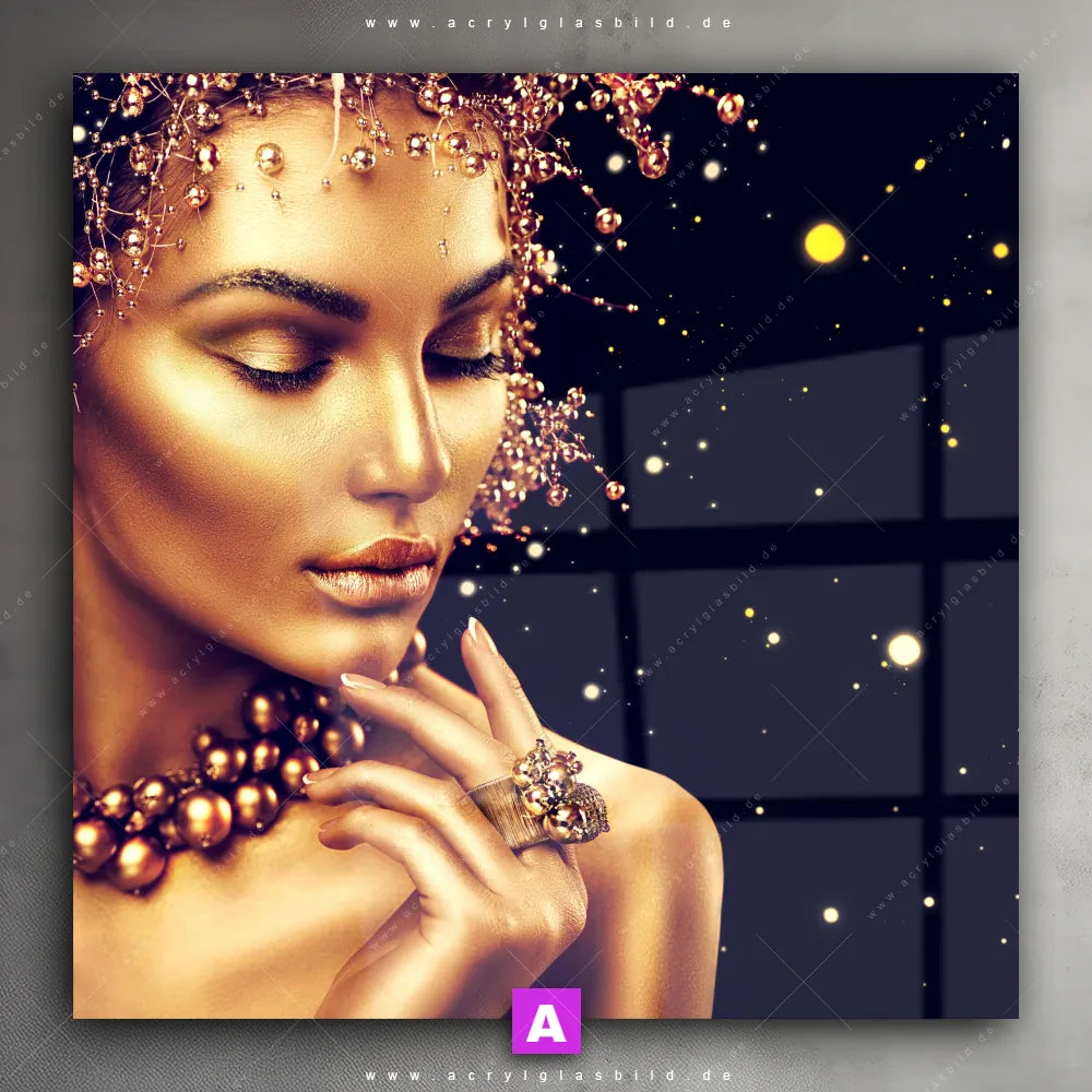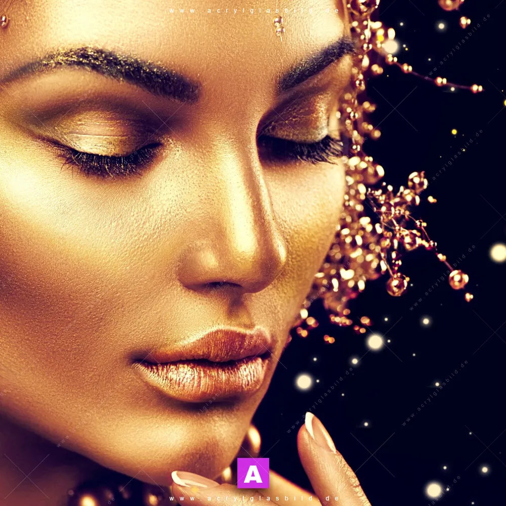 <b>Produktart:</b> Acrylglasbild | Glasbild | Wandbild aus Kunstglas | <b> Motiv:</b> Golden Girl | <b> Bildausrichtung:</b> Quadrat | <b> Max. Motiv-Größe:</b> 300cm breit | 300cm hoch | <b> Verfügbare Formate: </b> Quadrat, Querformat, Hochformat, Panorama, Schmal, Rund | <b> Kategorie:</b> Porträts - Menschen | <b> Farben:</b> Gold, Schwarz | <b> Kunstformen:</b> Fotografie | <b> Kunststile:</b> Modern Art, Minimalistisch