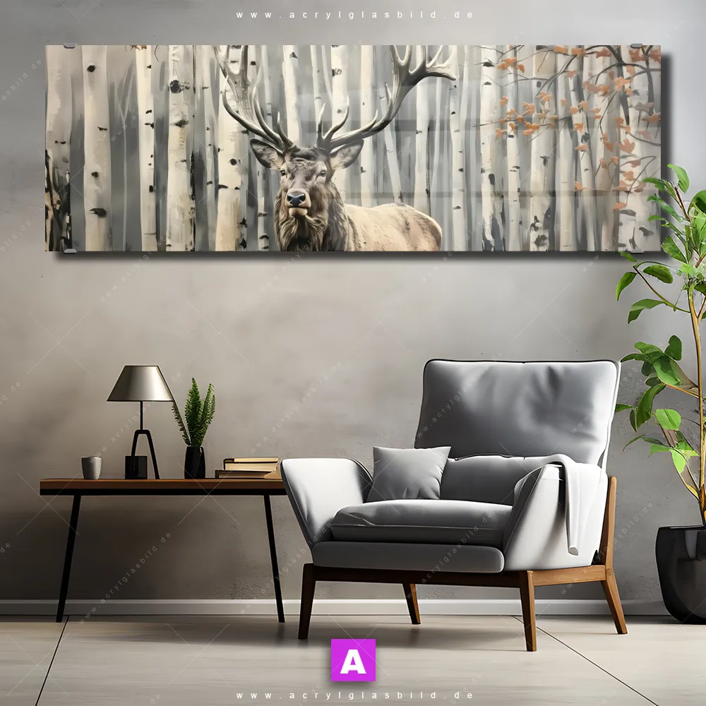 <b>Produktart:</b> Acrylglasbild | Glasbild | Wandbild aus Kunstglas | <b> Motiv:</b> Hirsch im Birkenwald | <b> Bildausrichtung:</b> Panorama | <b> Max. Motiv-Größe:</b> 450cm breit | 300cm hoch | <b> Verfügbare Formate: </b> Quadrat, Querformat, Hochformat, Panorama, Schmal, Rund | <b> Kategorie:</b> Tierwelt, Landschaften, Wald - Bäume | <b> Farben:</b> Beige, Braun, Weiss | <b> Kunstformen:</b> Kunst - Malerei | <b> Kunststile:</b> Retro - Vintage, Mixed Media