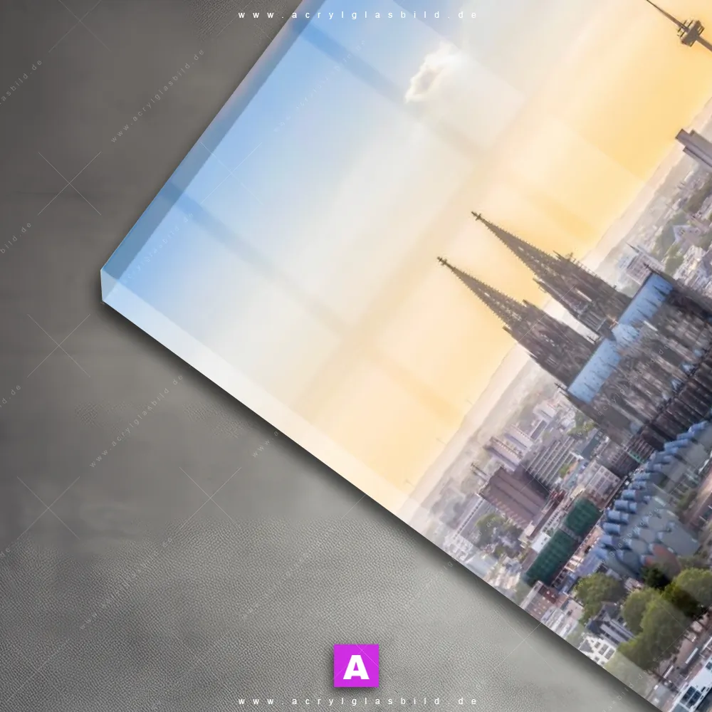 Das Motiv Kölner Skyline wird im UV-Direktdruck in den Farben Blau, Beige auf die Rückseite einer 5mm starken, transparenten Acrylglasplatte gedruckt. Das durchscheinende Motiv Köln mit Dom und Rhein im Natürlich - Realistisch Stil wird anschließend vollflächig mit einer weißen Schicht hinterlegt. Das Städte - Skylines Acrylglasbild | Quadrat erhält so eine bemerkenswerte Farbbrillanz, hohe Schärfe und erstaunliche Tiefenwirkung.