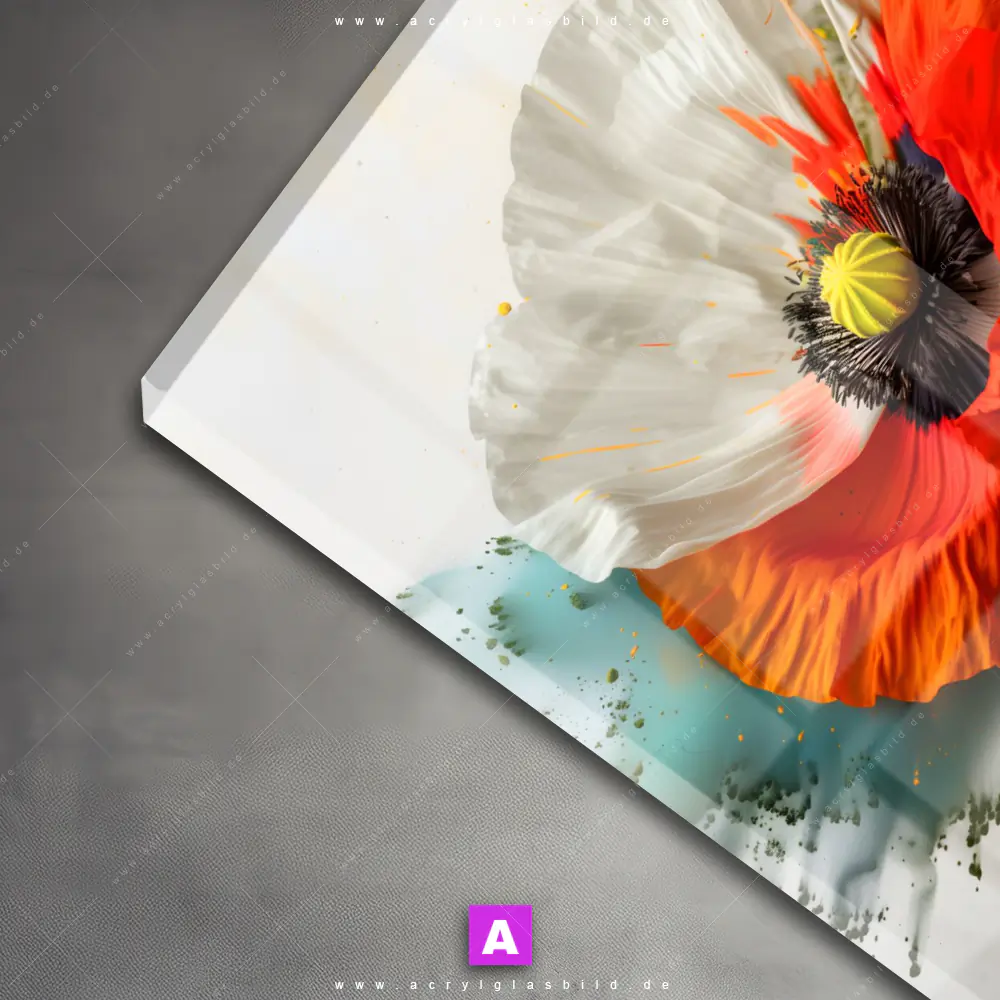 <b>Produktart:</b> Acrylglasbild | Glasbild | Wandbild aus Kunstglas | <b> Motiv:</b> Mohnblume im Farbnebel | <b> Bildausrichtung:</b> Quadrat | <b> Max. Motiv-Größe:</b> 270cm breit | 180cm hoch | <b> Verfügbare Formate: </b> Quadrat, Querformat, Hochformat, Panorama, Schmal, Rund | <b> Kategorie:</b> Blumen - Botanik | <b> Farben:</b> Weiss, Rot, Türkis, Gelb | <b> Kunstformen:</b> Digitale Kunst | <b> Kunststile:</b> Floral, Modern Art