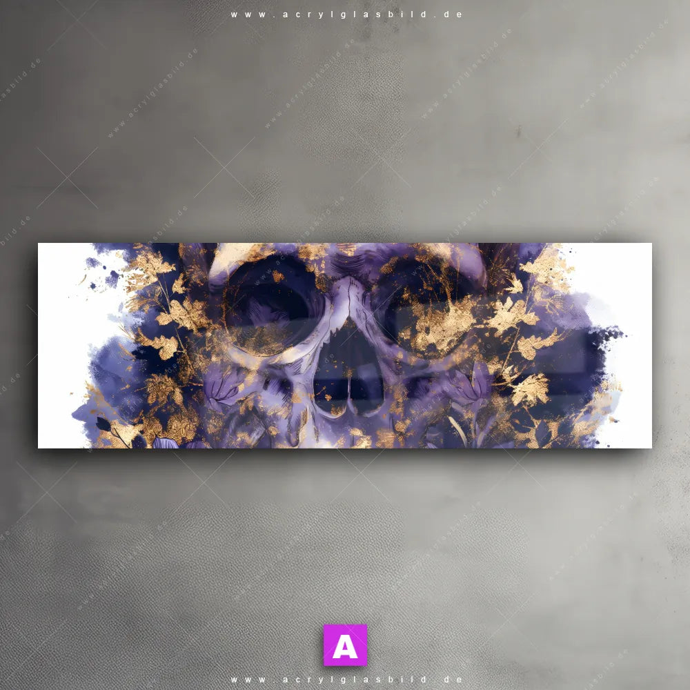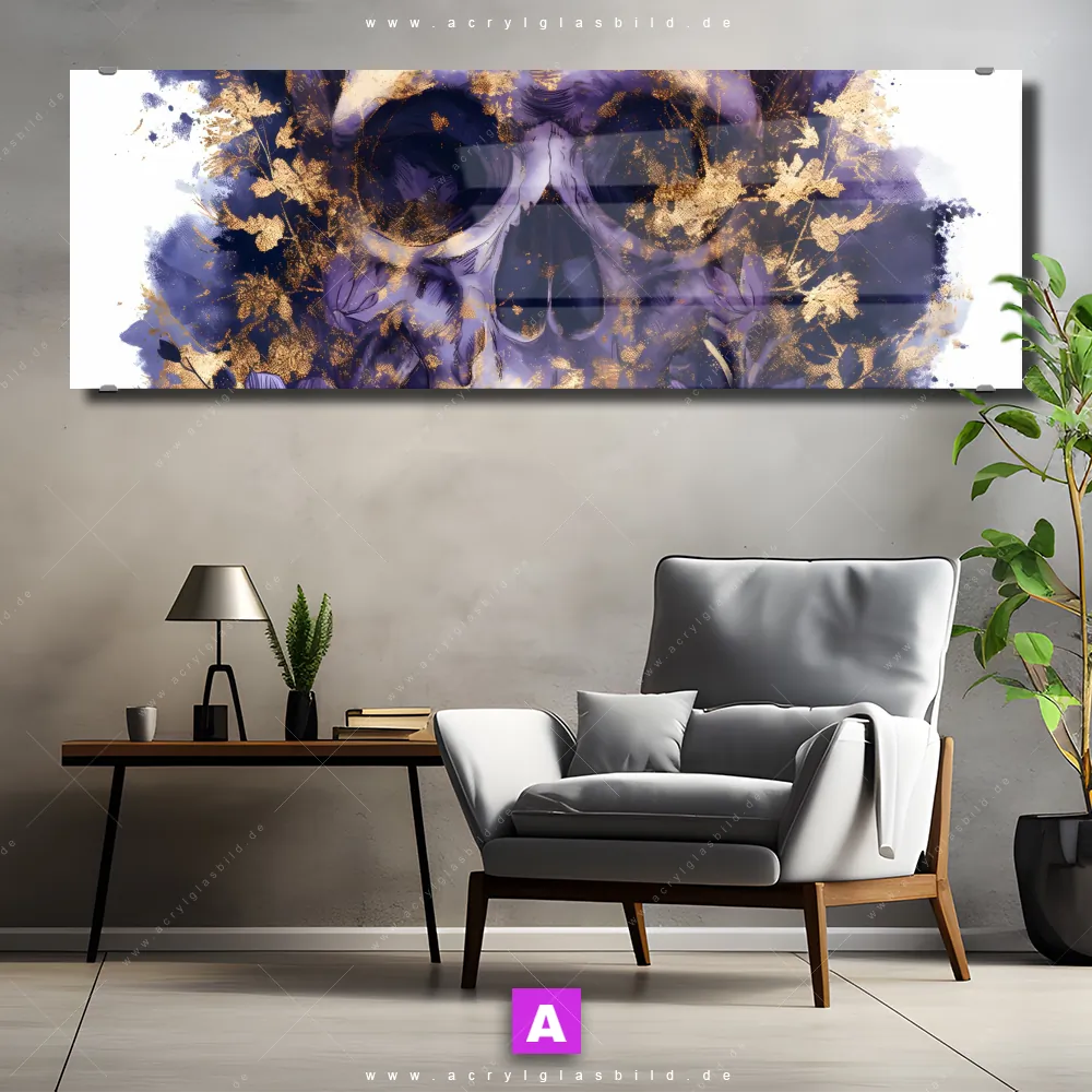 Fehlt dir die Inspiration beim Anblick deiner Wände, sodass selbst das Zählen der Wandfarbtropfen aufregender erscheint? Keine Sorge, wir haben das perfekte Kunstwerk für dich! Mit unserem Acrylglasbild Mystische Schädelkunst im Panorama-Format verleihst du deinem Raum den dringend benötigten Wow-Faktor. Lass deine Wände mit unserem Totenkopf in Gold und Lila Acrylglasbild zum Star werden!