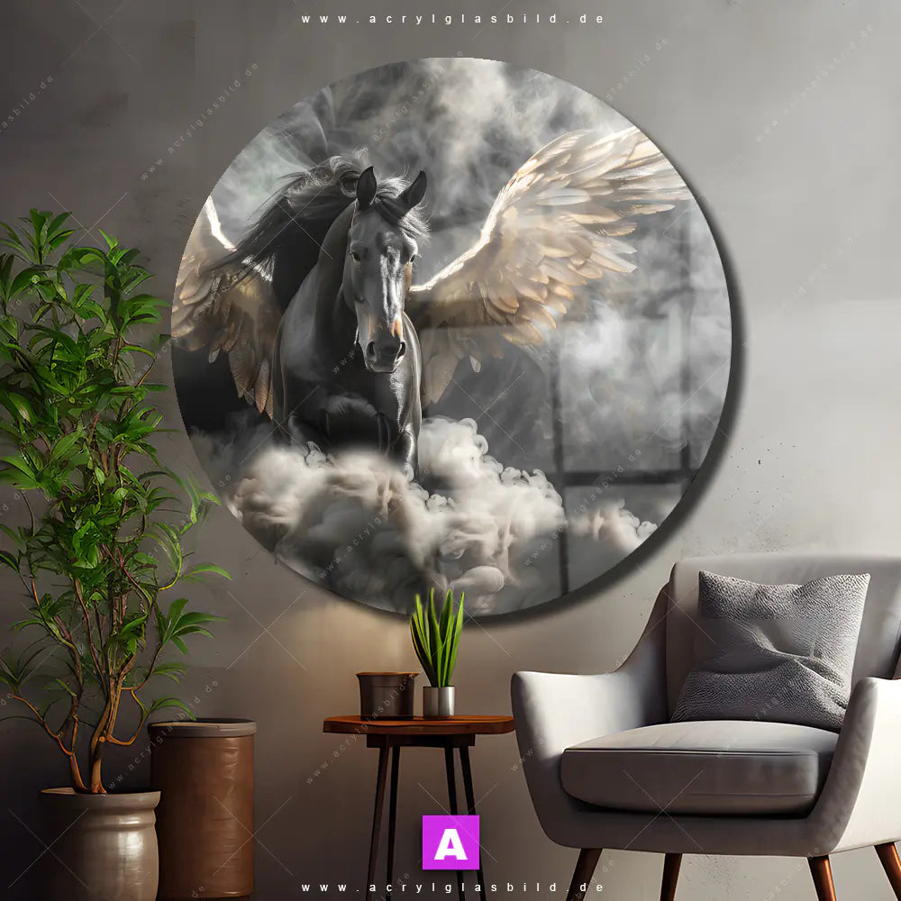 Hey du! Bist du es auch leid, auf langweilige, weiße Wände in deinem Raum zu starren und dich zu fragen, ob das der Sinn des Lebens ist? Unser Acrylglasbild mit dem Titel Mystisches Pferd mit Flügeln im Format Rund verwandelt deine Wand in ein Kunstwerk und macht deinen Raum zum absoluten Hingucker.