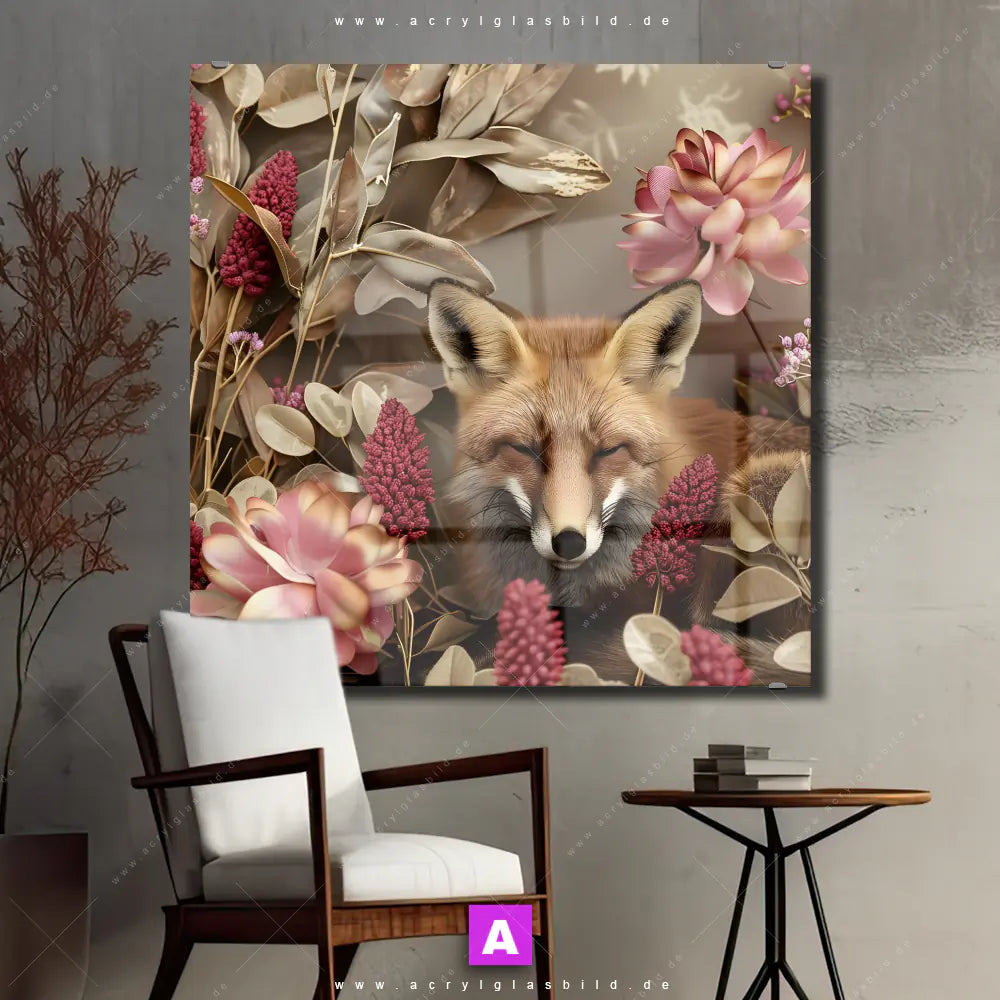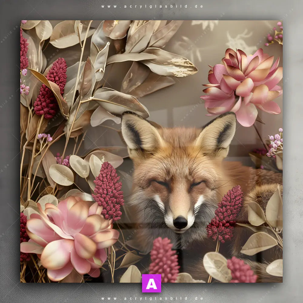 <b>Produktart:</b> Acrylglasbild | Glasbild | Wandbild aus Kunstglas | <b> Motiv:</b> Naturbild Fuchs und Blumen | <b> Bildausrichtung:</b> Quadrat | <b> Max. Motiv-Größe:</b> 360cm breit | 240cm hoch | <b> Verfügbare Formate: </b> Quadrat, Querformat, Hochformat, Panorama, Schmal, Rund | <b> Kategorie:</b>  Tierwelt, Blumen - Botanik | <b> Farben:</b>  Braun, Beige, Pink, Rosa, Gold | <b> Kunstformen:</b>  Digitale Kunst, Fotografie | <b> Kunststile:</b>  Floral, Retro - Vintage