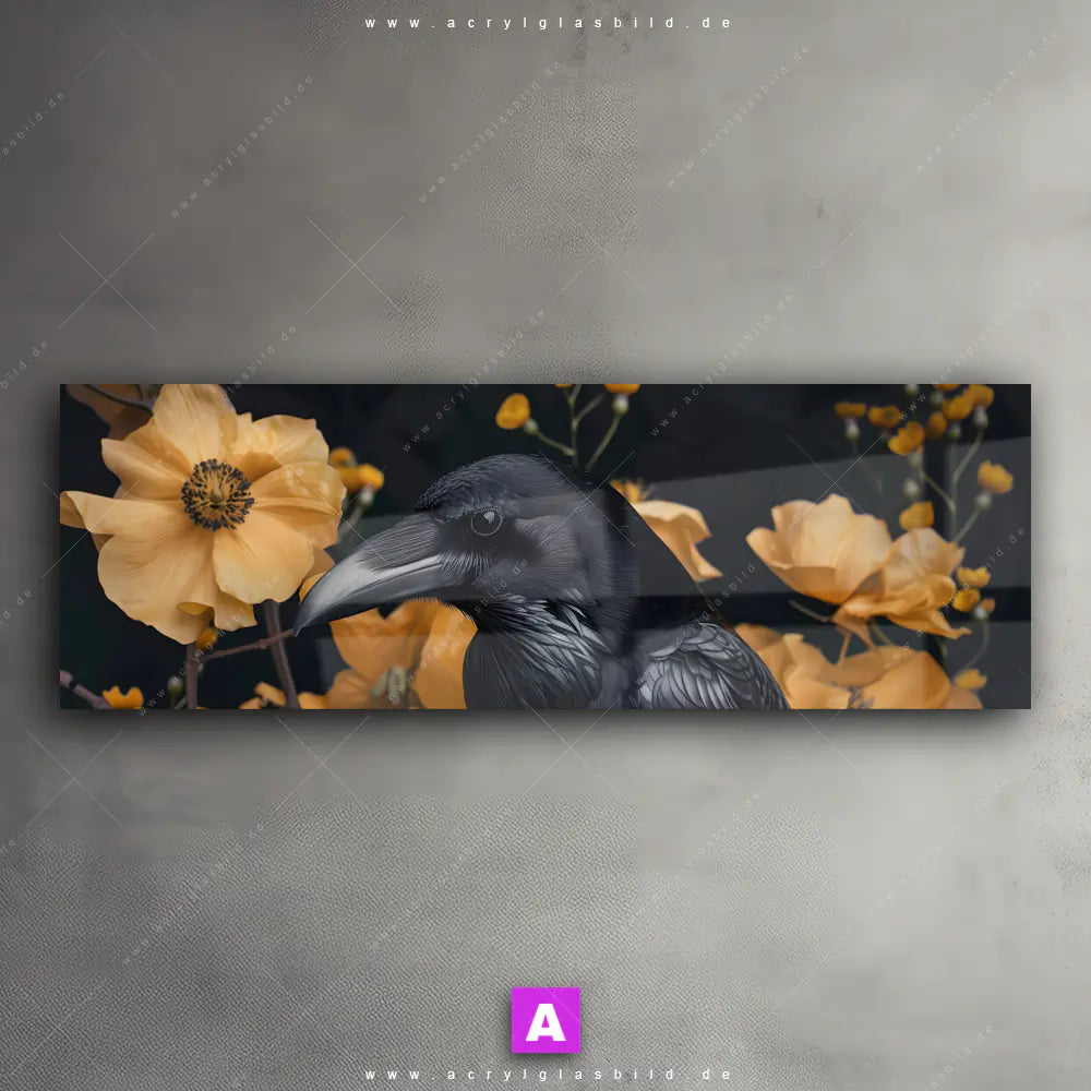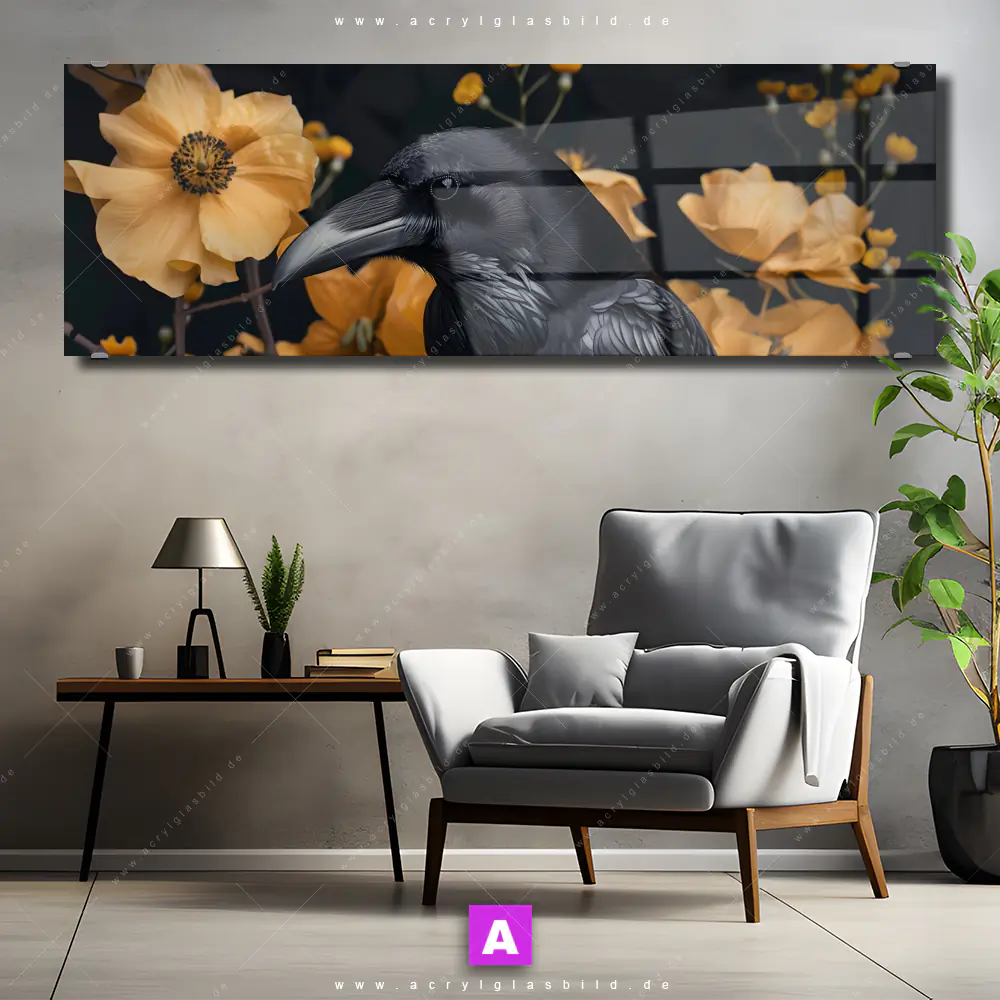 <b>Produktart:</b> Acrylglasbild | Glasbild | Wandbild aus Kunstglas | <b> Motiv:</b> Naturbild - Rabe & Blüten | <b> Bildausrichtung:</b> Panorama | <b> Max. Motiv-Größe:</b> 270cm breit | 180cm hoch | <b> Verfügbare Formate: </b> Quadrat, Querformat, Hochformat, Panorama, Schmal, Rund | <b> Kategorie:</b> Tierwelt, Blumen - Botanik | <b> Farben:</b> Schwarz, Beige, Ocker, Gelb | <b> Kunstformen:</b> Digitale Kunst, Fotografie | <b> Kunststile:</b> Floral, Natürlich - Realistisch