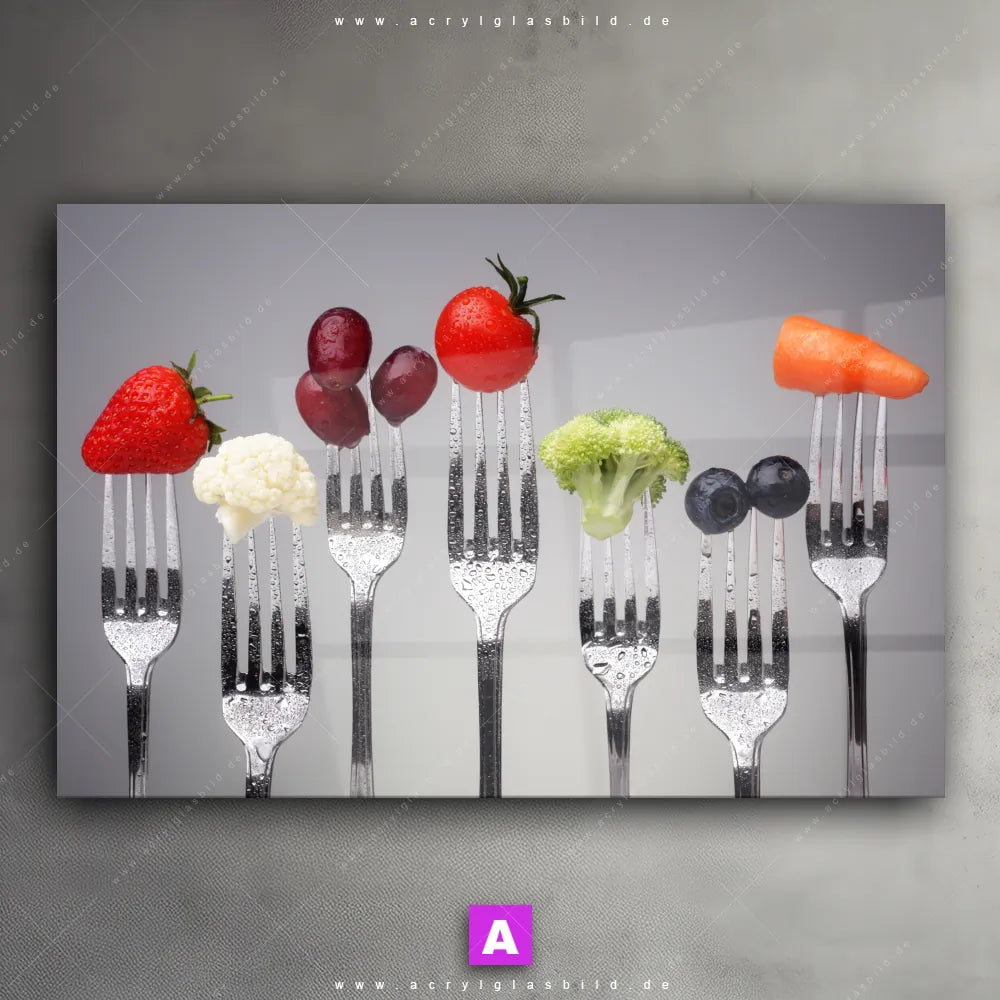 <b>Produktart:</b> Acrylglasbild | Glasbild | Wandbild aus Kunstglas | <b> Motiv:</b> Obst & Gemüse auf Gabeln | <b> Bildausrichtung:</b> Querformat | <b> Max. Motiv-Größe:</b> 450cm breit | 300cm hoch | <b> Verfügbare Formate: </b> Quadrat, Querformat, Hochformat, Panorama, Schmal, Rund | <b> Kategorie:</b> Essen - Trinken | <b> Farben:</b> Grün, Rot, Silber, Gelb , Blau, Orange, Mint, Lila, Bunt | <b> Kunstformen:</b> Fotografie | <b> Kunststile:</b> Natürlich - Realistisch, Modern Art