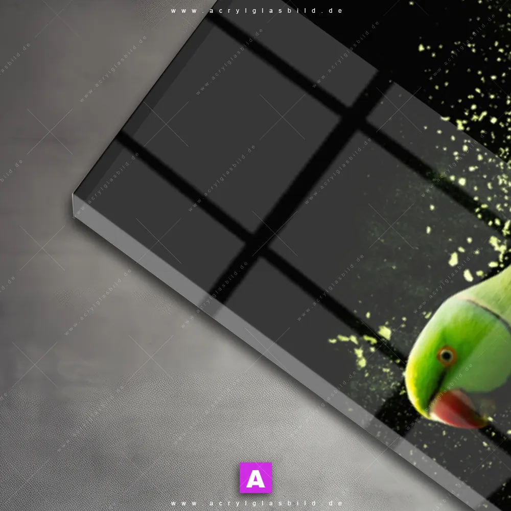 Das Motiv Papagei - grüne Farbexplosion wird im UV-Direktdruck in den Farben Schwarz, Grün auf die Rückseite einer 5mm starken, transparenten Acrylglasplatte gedruckt. Das durchscheinende Motiv Halsbandsittich spritzt Farbe im Natürlich - Realistisch, Modern Art Stil wird anschließend vollflächig mit einer weißen Schicht hinterlegt. Das Tierwelt Acrylglasbild | Schmal erhält so eine bemerkenswerte Farbbrillanz, hohe Schärfe und erstaunliche Tiefenwirkung.