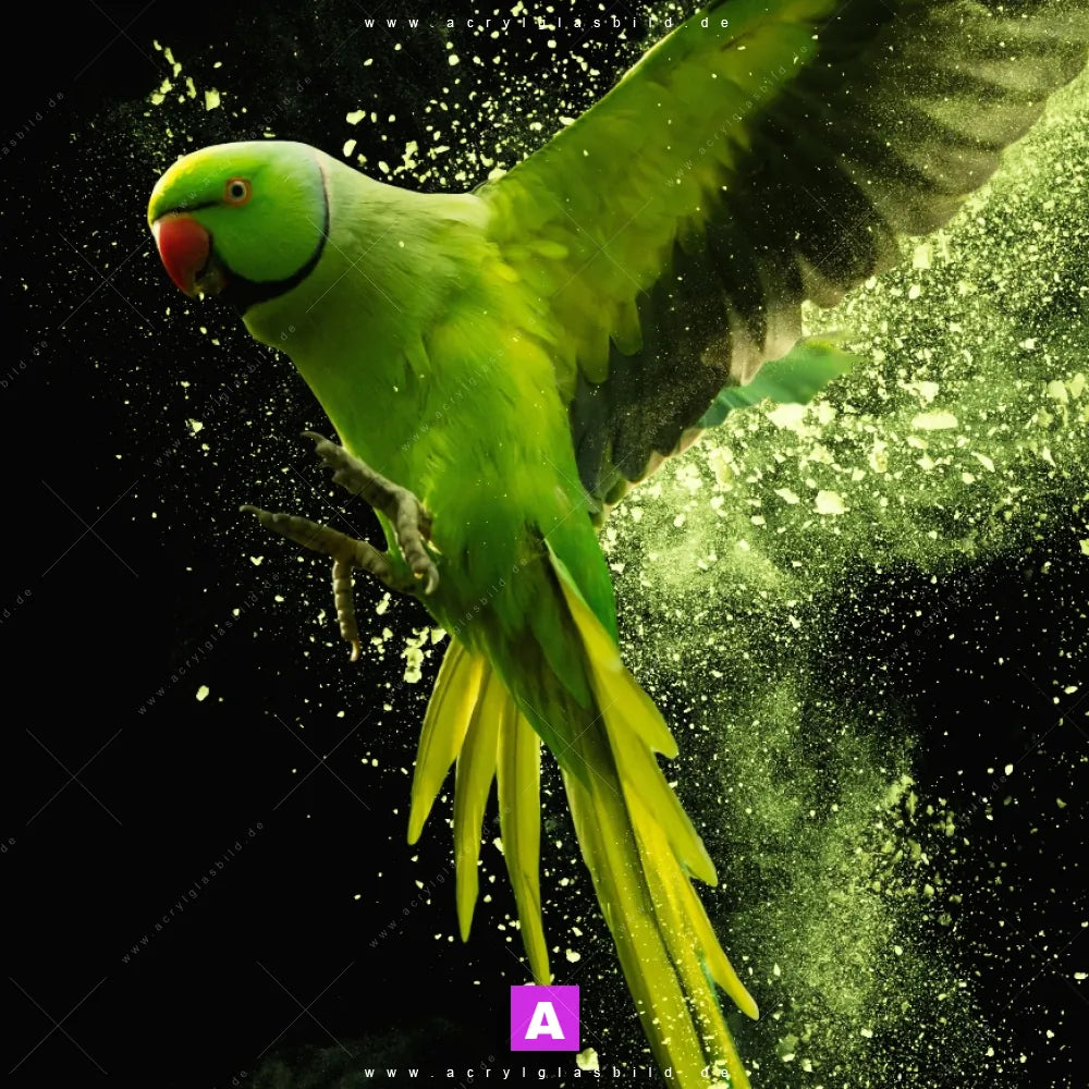 Vergiss also langweilige weiße Wände und entscheide dich für das Acrylglasbild grüner Papagei spritzt grüne Farbe, gestaltet als Fotografie, das deinem Raum Charakter verleiht und dich jeden Tag aufs Neue inspiriert. Mit diesem Tierwelt Acrylglasbild wird deine Wand zur Kunst und du zum Kunstliebhaber.